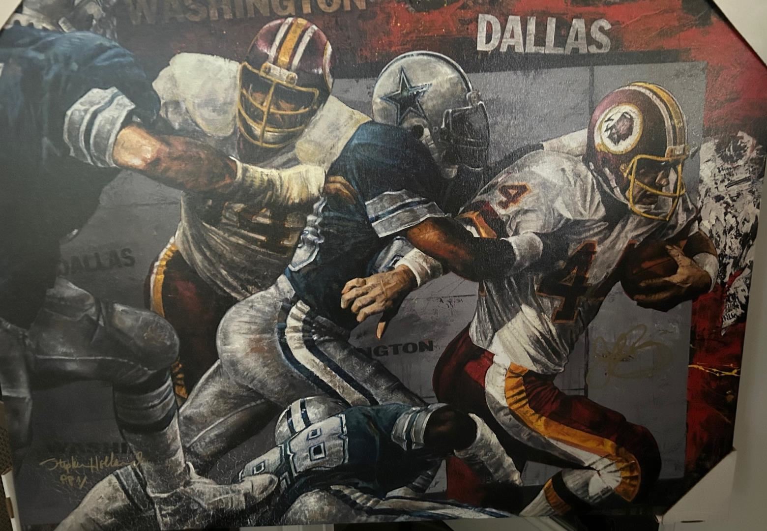 "The Rivalry" by Stephen Holland, signed by John Riggins & artist 27.5"x39.75" giclee PP2;stretched canvas, AS IS, cracking bottom left. W/COA