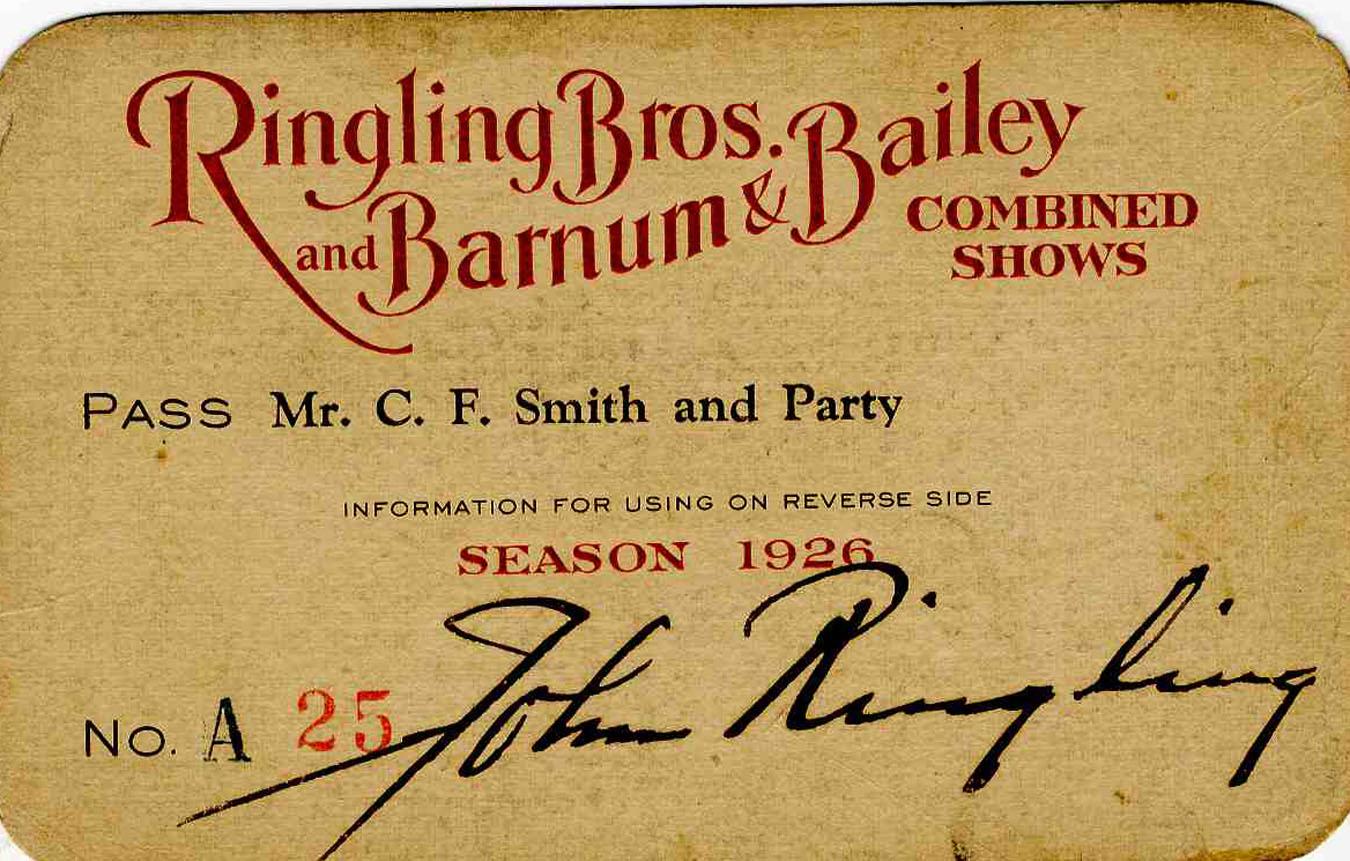 Ringling Bros. and Barnum & Bailey Combined Shows circus pass for the 1926 season, the year that Edward Ringling died, at the height of the circus's popularity. Signed in black fountain pen by John Ringling. Stamped as no. A 25 for Mr. C.F. Smith and Party. Pass measures 4'' x 2.5''. Some soil due to handling over time to edges, with very minute chipping. Minimal glue residue to back, otherwise very good condition.