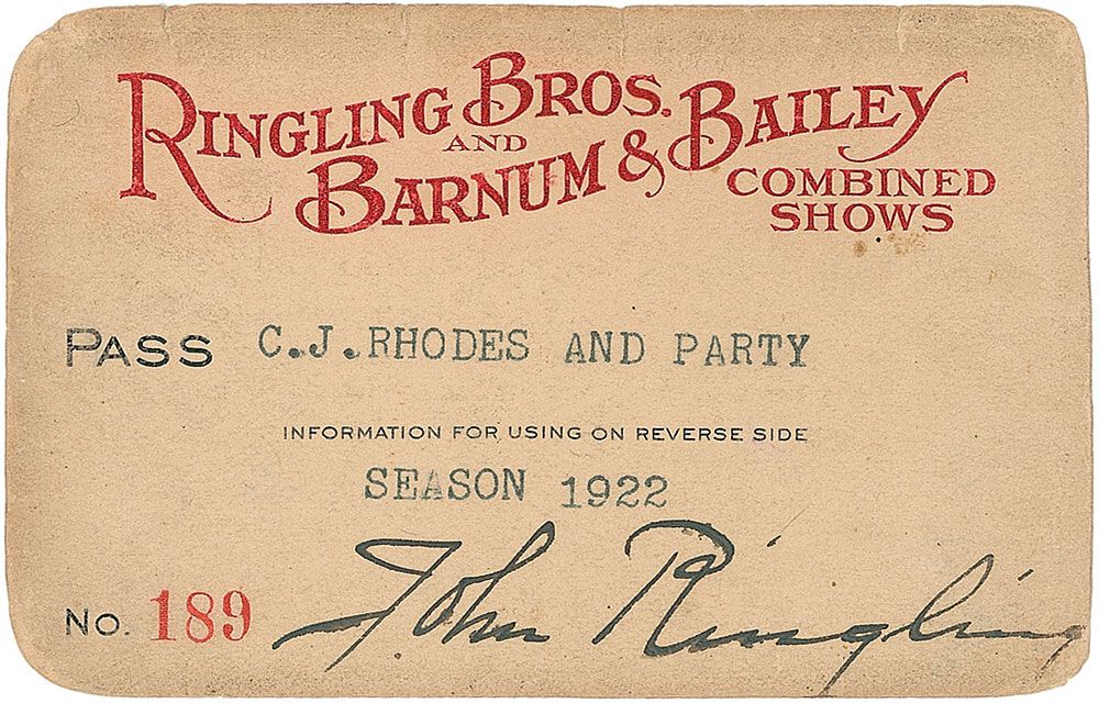 John (1866–1936), youngest of the famed Ringling brothers, was involved in a number of successful business enterprises. In 1929 he purchased the Circus Corporation of America, which gave him control of 11 circuses. Ringling Bros.and Barnum & Bailey Combined Shows 1922 circus pass, 4 X 2.5, issued to “C. J. Rhodes and Party,” signed at the bottom in black ink by John Ringling. In very good condition, with scattered light toning and soiling, some light feathering to signature, and a few small vertical tears to top edge. Accompanied by a 1922 letter of transmittal from Richard Fuchs forwarding the pass to Rhodes on behalf of Ringling and the original mailing envelope.