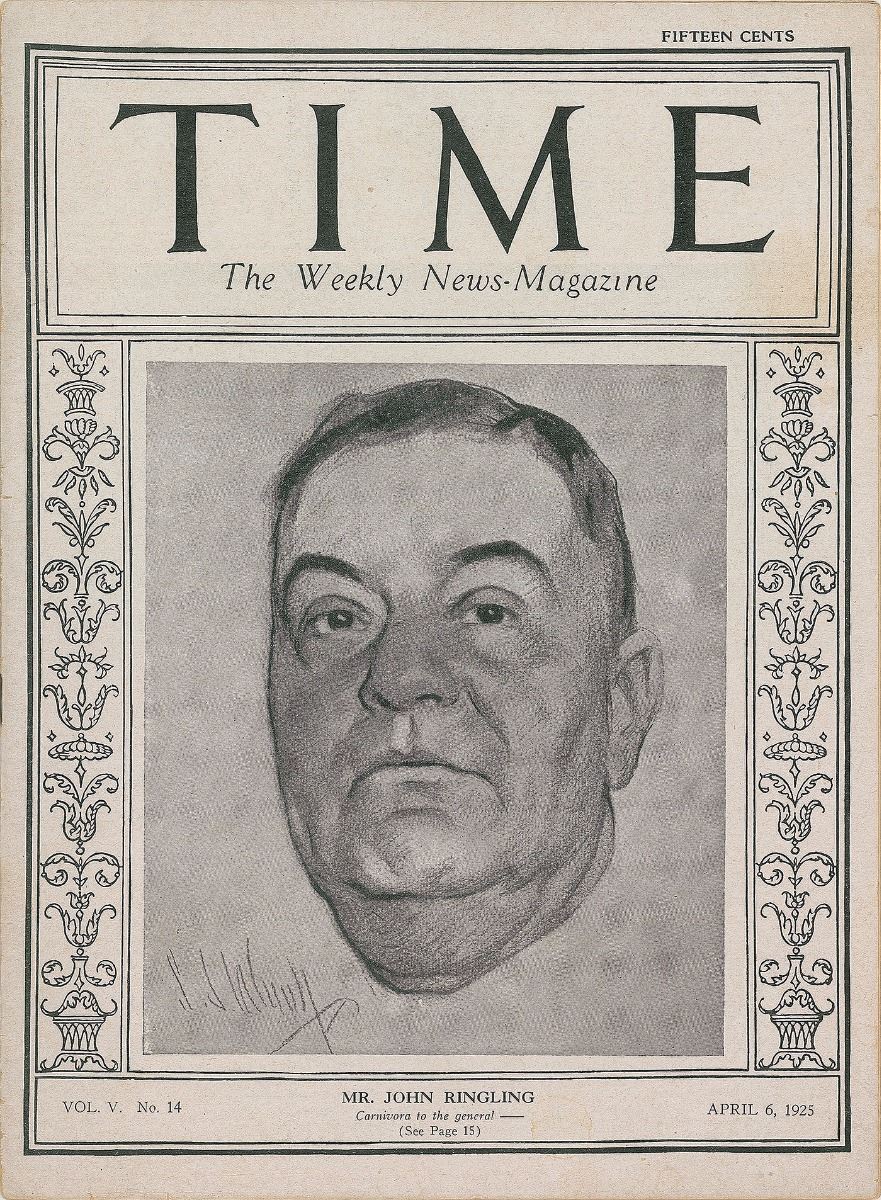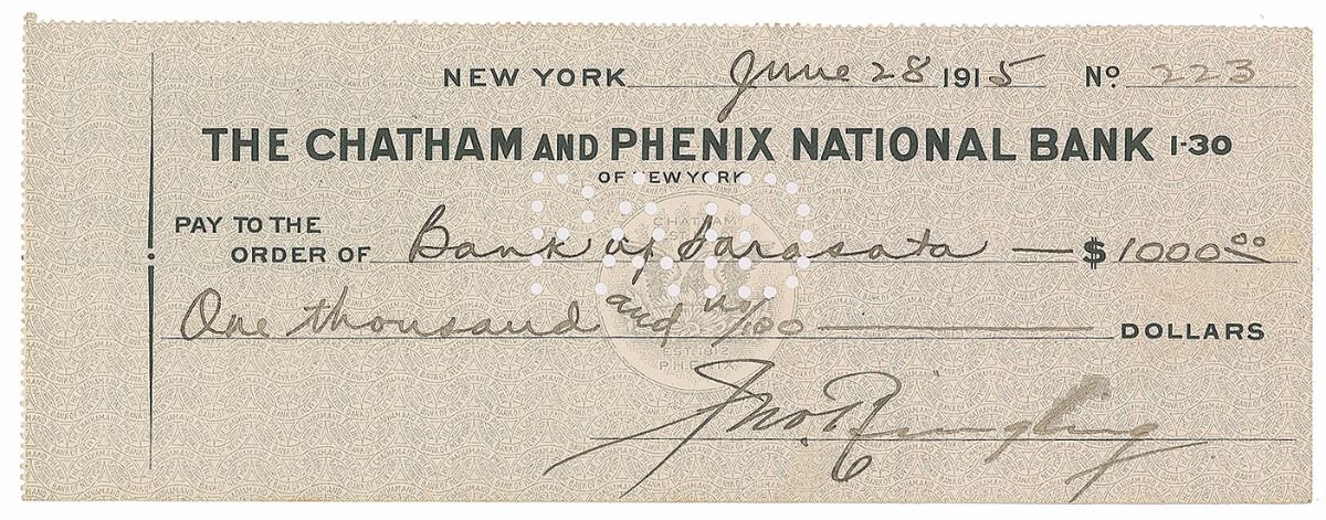 Youngest of the famed Ringling brothers (1866–1936) who purchased the Circus Corporation of America in 1929. Bank check, 8.25 x 3, filled out in another hand and signed by Ringling, “Jno. Ringling,” payable to Bank of Sarasota for $1000, June 28, 1915. In fine condition. Accompanied by an unsigned 1925 issue of Time magazine depicting Ringling on the cover.