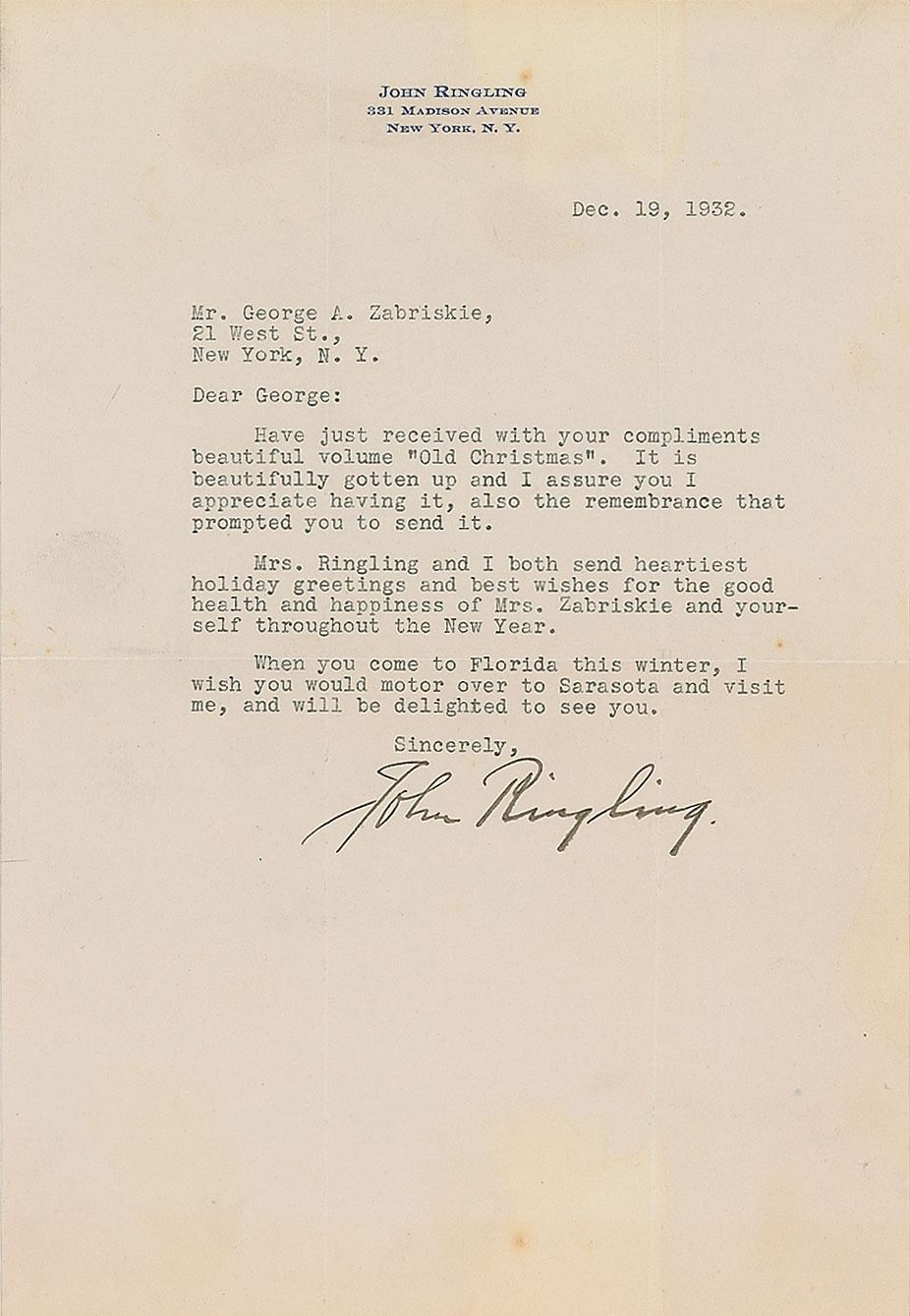 TLS, one page, 7.25 x 10.5, personal letterhead, December 19, 1932. Letter to George A. Zabriskie, in part: "Have just received with your compliments beautiful volume 'Old Christmas.' It is beautifully gotten up and I assure you I appreciate having it, also the remembrance that prompted you to send it. Mrs. Ringling and I both send heartiest holiday greetings and best wishes for the good health and happiness of Mrs. Zabriskie and yourself throughout the New Year." In fine condition.