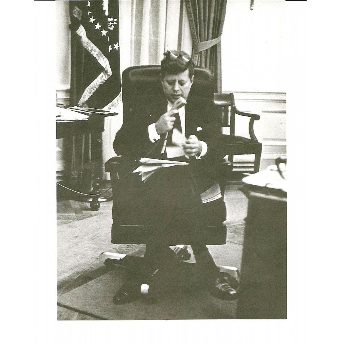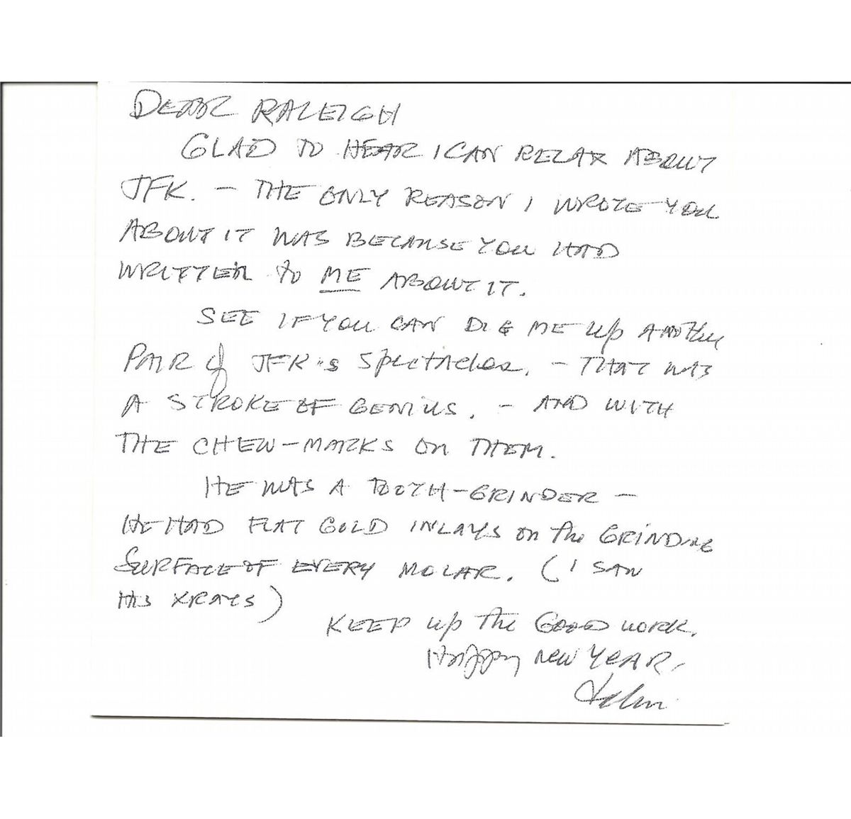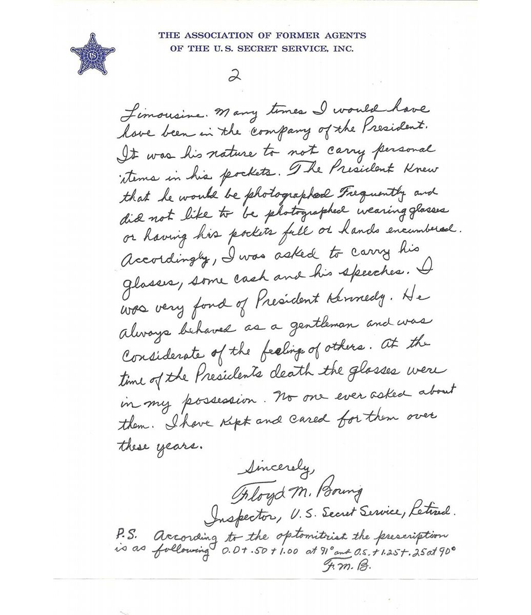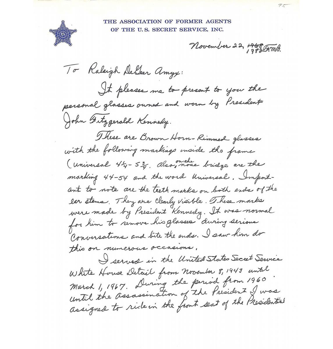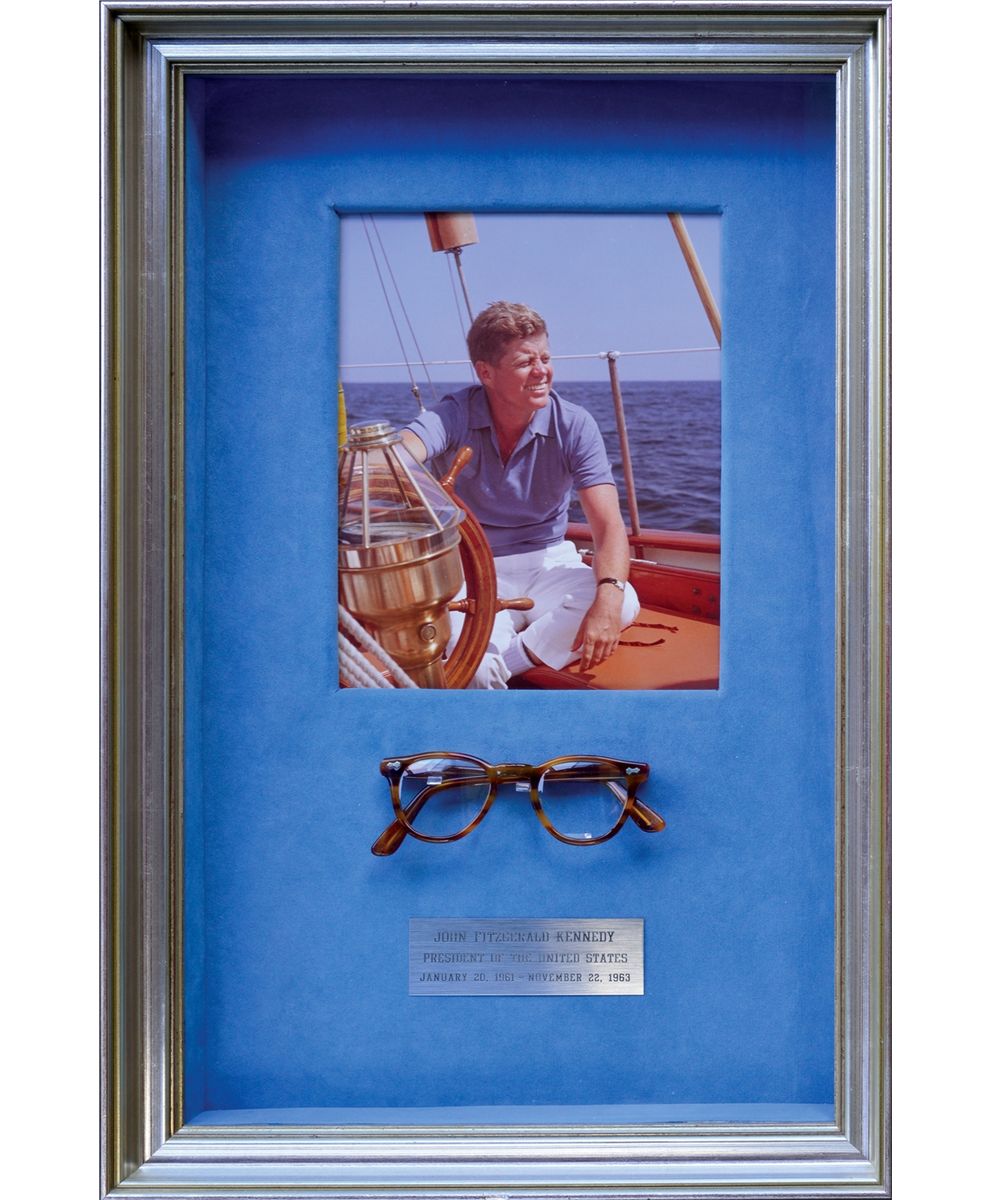 A pair of prescription eyeglasses used by John F. Kennedy during his presidency, originally acquired by Inspector Floyd Boring, the Secret Service agent in charge of the White House detail, at the time of President Kennedy’s assassination. Boring often accompanied the president and had Kennedy’s glasses in his possession when he traveled to Tampa, Florida with him just three days before the assassination. The brown horn-rimmed prescription glasses are marked “Universal” inside the frame along with several numbers. The ends of both ear stems also bear teeth marks of Kennedy from having been chewed on by JFK. Impressively framed with hand-wrapped blue suede matting, an informational plaque, and a color portrait of Kennedy sailing, to an overall size of 22 x 14. Accompanied by a handwritten letter of provenance from Inspector Floyd Boring to noted collector Raleigh DeGeer Amyx, dated November 22, 1982 and written on Secret Service stationery, which reads, in part: “It pleases me to present to you the personal glasses owned and worn by President John Fitzgerald Kennedy. These are brown horn-rimmed glasses with…teeth marks on both ends of the ear stems…It was normal for him to remove his glasses during serious conversations and bite the ends…Many times I would have been in the company of the President. It was his nature not to carry personal items in his pockets. The President knew that he would be photographed frequently and did not like to be photographed wearing glasses or having his pockets full or hands encumbered. Accordingly, I was asked to carry his glasses, some cash, and his speeches…At the time of the President’s death the glasses were in my possession. No one ever asked about them. I have kept and cared for them over these years.” Letter additionally covers JFK’s appropriate eyeglass prescription. Also included are two photos of Kennedy with these glasses, a photo of Secret Service Agent Boring holding the JFK glasses before presenting them to Amyx, and a letter to Amyx from Dr. John Lattimer, renowned JFK and Lincoln assassination historian, requesting a pair of JFK glasses with teethmarks.