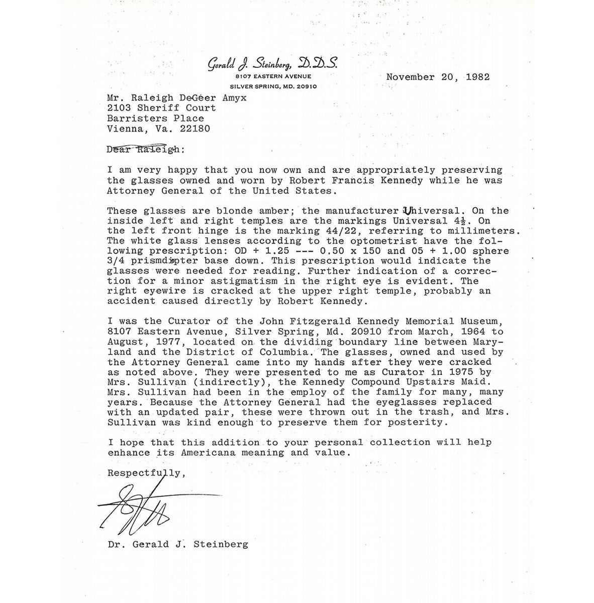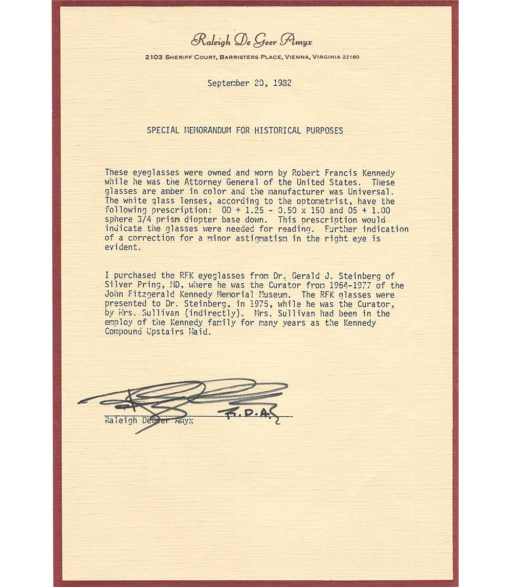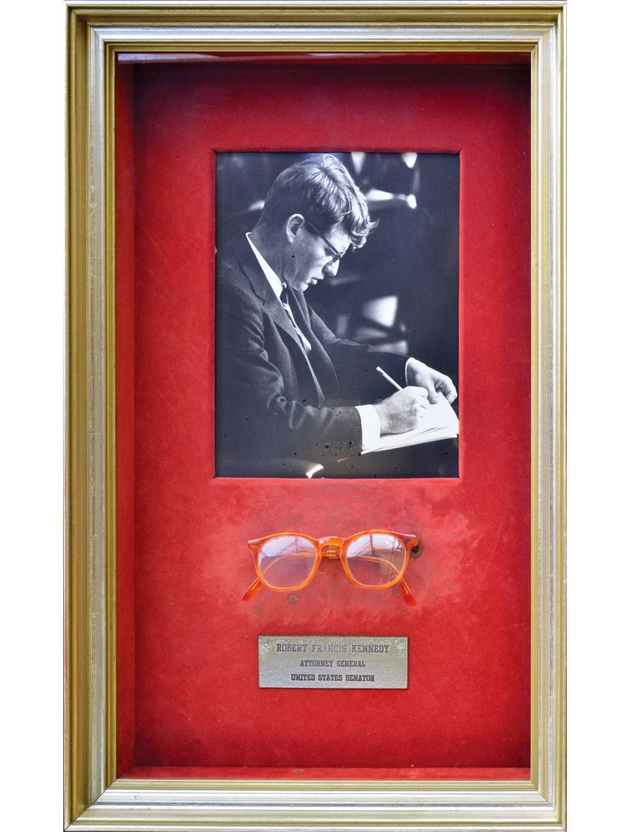 Robert F. Kennedy’s personally-owned and -worn eyeglasses. Light brown frame prescription reading eyeglasses, marked “Universal” on the frame, originally acquired by an upstairs maid from the Kennedy compound in Hyannis Port, Massachusetts, and later given to optician Dr. Gerald Steinberg. The glasses are handsomely framed with rust-colored hand-wrapped suede matting, a portrait of Kennedy at work, while wearing the glasses, and a small name plaque to an overall size of 22 x 14. The right eyewire may be cracked at the upper right temple. Accompanied by a letter of provenance from Steinberg to Amyx, dated November 20, 1982, which reads, in part: “I am very happy that you now own…the glasses owned and worn by Robert Francis Kennedy while he was Attorney General of the United States…The white glass lenses according to the optometrist have the following prescription: OD+1.25—0.50 x 150 and 05 + 1.00 sphere 3/4 prismdiopter base down. This prescription would indicate the glasses were needed for reading…The right eyewire is cracked…I was the Curator of the John Fitzgerald Kennedy Memorial Museum…The glasses, owned and used by the Attorney General came into my hands after they were cracked…They were presented to me as Curator in 1975 by Mrs. Sullivan (indirectly), the Kennedy Compound Upstairs maid…Because the Attorney General had the eyeglasses replaced with an updated pair, these were thrown out in the trash and Mrs. Sullivan was kind enough to preserve them for posterity.” Also included is a letter of provenance from Amyx, dated September 20, 1982, which states: “These eyeglasses were owned and worn by Robert Francis Kennedy while he was Attorney General of the United States…I purchased the RFK eyeglasses from Dr. Gerald J. Steinberg…he was the Curator from 1964-1977 of the John Fitzgerald Kennedy Memorial Museum. The RFK glasses were presented to Dr. Steinberg, in 1975, while he was Curator, by Mrs. Sullivan (indirectly).”
