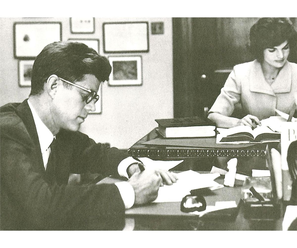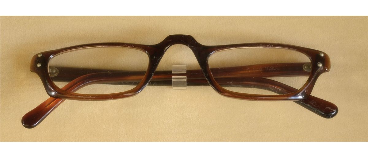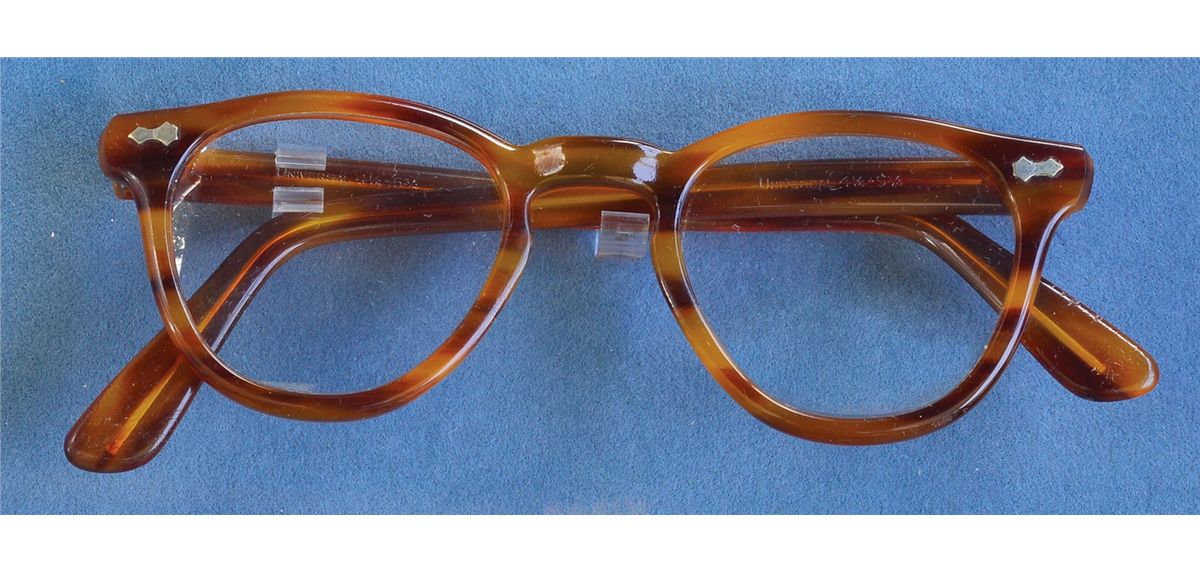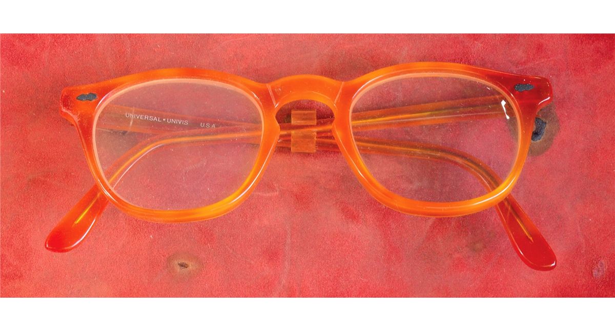 Robert F. Kennedy’s personally-owned and -worn eyeglasses. Light brown frame prescription reading eyeglasses, marked “Universal” on the frame, originally acquired by an upstairs maid from the Kennedy compound in Hyannis Port, Massachusetts, and later given to optician Dr. Gerald Steinberg. The glasses are handsomely framed with rust-colored hand-wrapped suede matting, a portrait of Kennedy at work, while wearing the glasses, and a small name plaque to an overall size of 22 x 14. The right eyewire may be cracked at the upper right temple. Accompanied by a letter of provenance from Steinberg to Amyx, dated November 20, 1982, which reads, in part: “I am very happy that you now own…the glasses owned and worn by Robert Francis Kennedy while he was Attorney General of the United States…The white glass lenses according to the optometrist have the following prescription: OD+1.25—0.50 x 150 and 05 + 1.00 sphere 3/4 prismdiopter base down. This prescription would indicate the glasses were needed for reading…The right eyewire is cracked…I was the Curator of the John Fitzgerald Kennedy Memorial Museum…The glasses, owned and used by the Attorney General came into my hands after they were cracked…They were presented to me as Curator in 1975 by Mrs. Sullivan (indirectly), the Kennedy Compound Upstairs maid…Because the Attorney General had the eyeglasses replaced with an updated pair, these were thrown out in the trash and Mrs. Sullivan was kind enough to preserve them for posterity.” Also included is a letter of provenance from Amyx, dated September 20, 1982, which states: “These eyeglasses were owned and worn by Robert Francis Kennedy while he was Attorney General of the United States…I purchased the RFK eyeglasses from Dr. Gerald J. Steinberg…he was the Curator from 1964-1977 of the John Fitzgerald Kennedy Memorial Museum. The RFK glasses were presented to Dr. Steinberg, in 1975, while he was Curator, by Mrs. Sullivan (indirectly).”