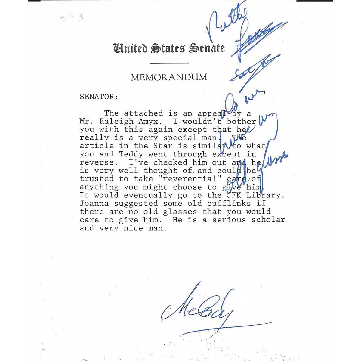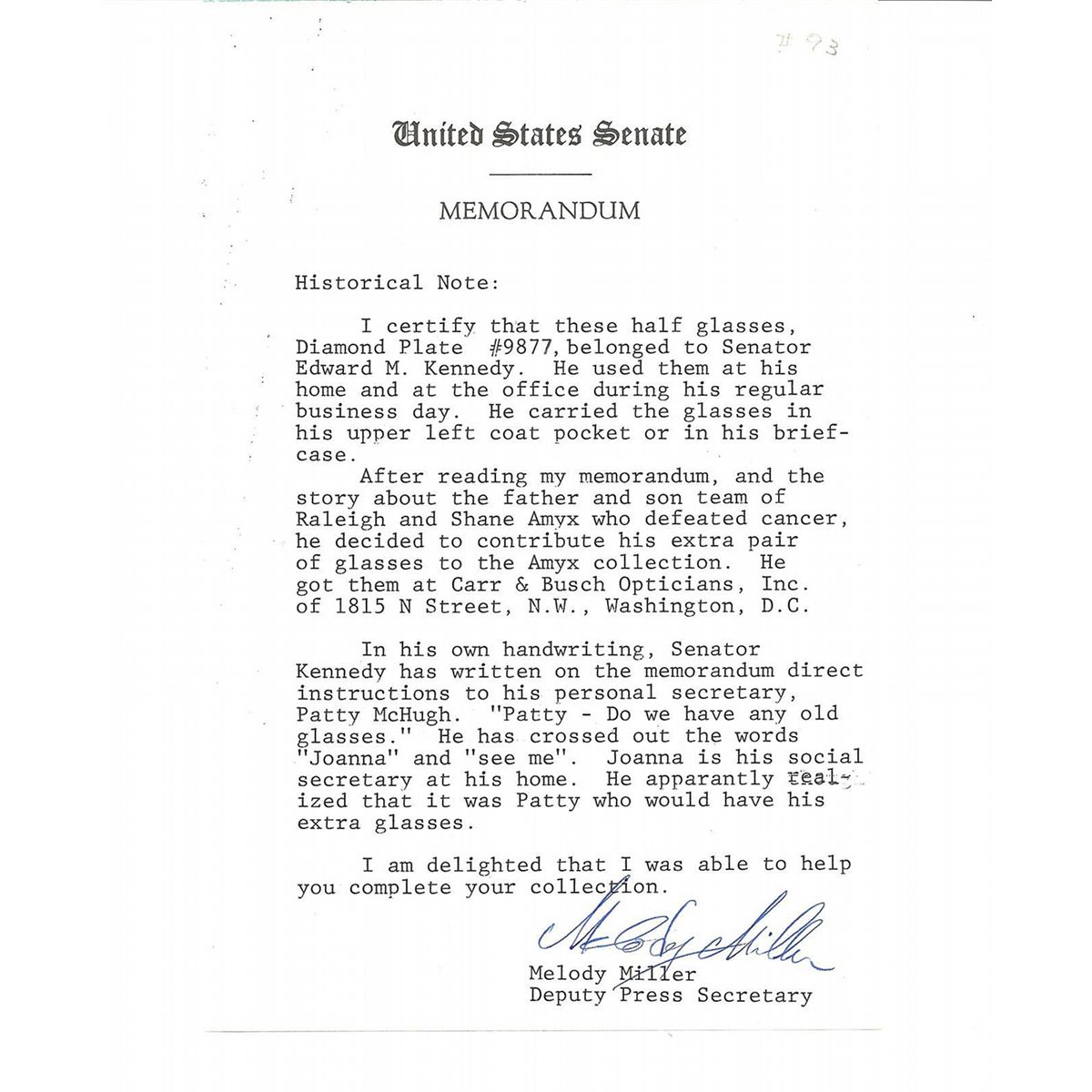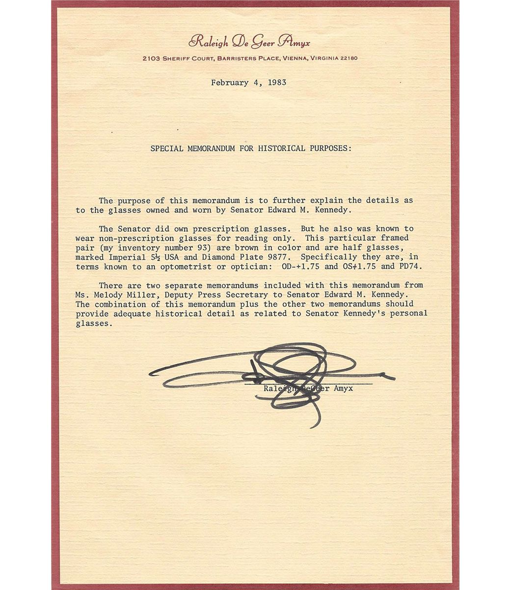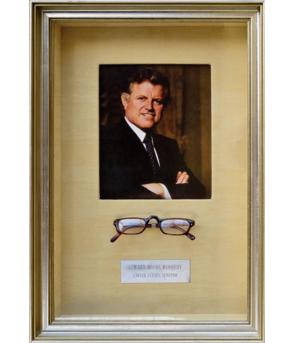 A pair of Senator Ted Kennedy’s personally-owned and -worn prescription eyeglasses. These brown framed half-glasses were presented directly to Amyx by Senator Kennedy himself, with the help of his Press Secretary, Melody Miller, to assist in completing this set of glasses from all three Kennedy brothers. Handsomely framed with tan-colored hand-wrapped suede matting, a color portrait of Kennedy, and a small plaque to an overall size of 22 x 14. In fine condition. Accompanied by three letters of provenance about the glasses, each on United States Senate Memorandum letterhead. The first is a memo to Senator Kennedy from Melody Miller, press secretary, which requests, “The attached is an appeal by a Mr. Raleigh Amyx…The article in the Star is similar to what you and Teddy went though except in reverse…He is very well thought of, and could be trusted to take ‘reverential’ care of anything you might choose to give him…Joanna suggested some old cufflinks if there are no old glasses that you would care to give him.” On the memo, Kennedy has written, “Patty—Do we have any old glasses.” A second letter from Miller reads, in part: “I certify that these half glasses…belonged to Senator Edward M. Kennedy. He used them at his home and at his office…After reading my memorandum, and the story about the father and son team of Raleigh and Shane Amyx who defeated cancer, he decided to contribute his extra pair of glasses to the Amyx collection. He got them at Carr & Busch Opticians, Inc. of 1815 N Street, N.W., Washington, D. C.” The last letter, dated February 4, 1983, is from Amyx and corroborates the story. An incredibly well-documented grouping, and, undoubtedly, the only complete set of Kennedy eyeglasses assembled into one collection. Provenance: The Raleigh DeGeer Amyx Collection.