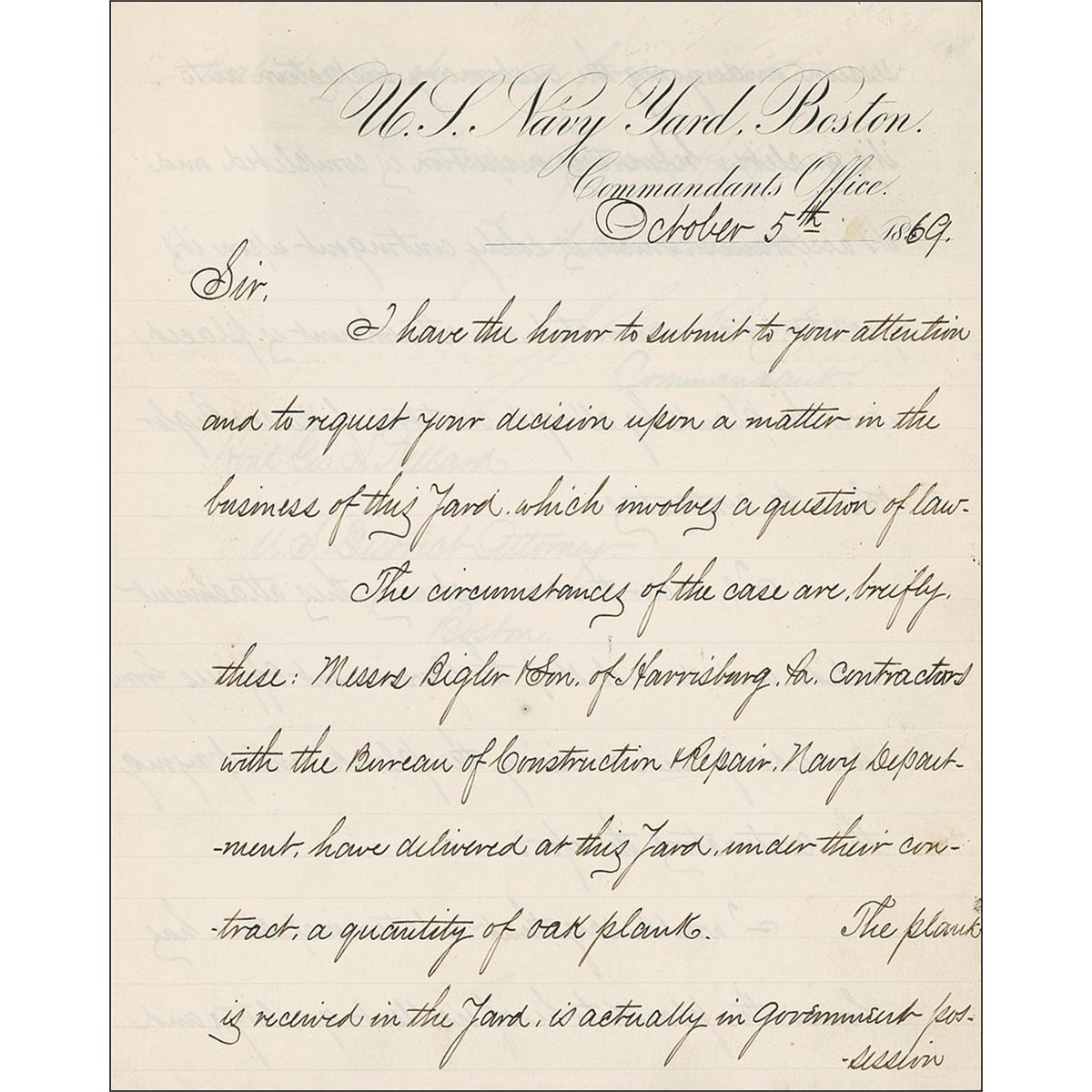 U.S. Naval officer during the Civil War. LS, three pages, lightly-lined on two adjoining sheets, 8 x 9.75, U.S. Navy Yard, Boston letterhead, October 5, 1869. Letter to U.S. District Attorney George Hillard regarding a legal matter at the yard concerning the receipt and payment of planks. In part: “The circumstances of the case are briefly these: Messrs. Bigler & Son…contracted with the Bureau of Construction & Repair…have delivered at this Yard, under their contract a quantity of oak plank. The plank is received in the Yard, is actually government possession undergoing the customary inspection as to its quality, before this inspection is completed and its acceptance…is consummated an attachment is placed upon the planks…Is under the circumstances, this attachment valid, and does it stop the Government Offices from processing and receiving the plank and paying the contractor therefor?” In fine condition.
