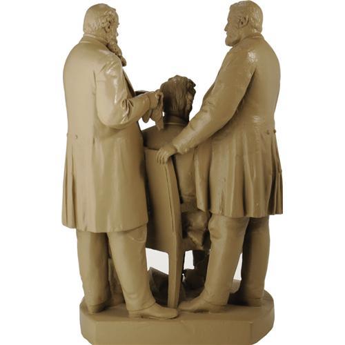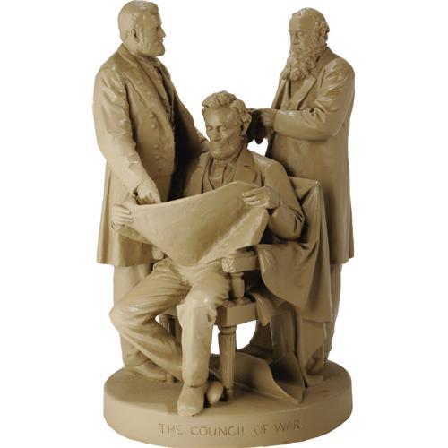 <B>Lincoln, Grant, & Stanton: John Roger's Famous "Council of War" Sculpture.</B></I> One of the most famous and popular nineteenth century sculptures. They were constructed of a durable, plaster-like material with rich painted surfaces. The sculpture debuted in 1867, but was so widely acclaimed and eagerly purchased that a number of reissues, varying slightly, were released through the late 1870s. The present example is the earliest style, with Stanton holding his hand behind Lincoln's head. This stance was criticized because it looked to some as if Stanton were holding a Derringer up to the president's head (there was wild speculation about assassination conspiracy theories, some of which claimed the secretary of war to be a co-conspirator). This sculpture is in beautiful condition, with no damage and only several very trivial small paint flakes. Measures approx. 24" tall x 17" wide x 13" deep.<BR><BR><b>Shipping:</b> Miscellaneous Collectibles, Larg (<a target="_blank" href="http://www.heritageauctions.com/common/shipping.php">view shipping information</a>)