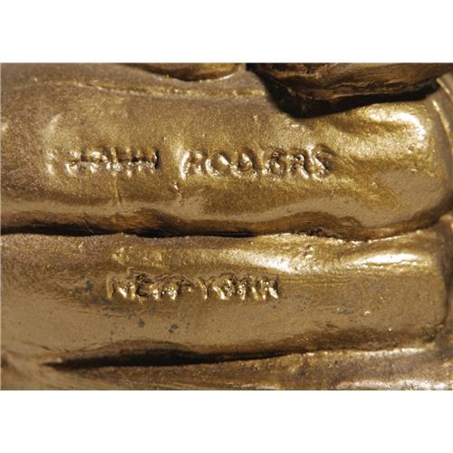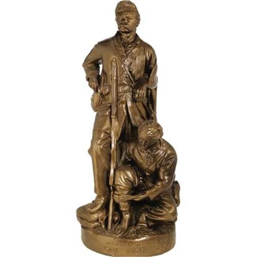 <B>John Rogers: His Classic Civil War Sculpture "Wounded to the Rear / One More Shot".</B></I> This evocative and finely detailed sculpture is made of a dense, plaster-like composition material with a painted surface. The present example appears to have been re-painted to simulate a bronze finish; the original was in a more muted tone. Otherwise in beautiful condition, this 1864 dated sculpture depicts a standing Union soldier with detailed accoutrement beside a seated comrade wearing a bandage around his head and apparently attending to a wounded foot; his shoe is removed and hanging at his side, and his pack is open in the foreground revealing an unfolded pocket knife. It is hard to tell whether the knife is intended for a surgical procedure, or was needed to remove the shoe. During the War, soldiers often wore the same shoes or boots for weeks without removing them, until they became so caked with dirt and blood that they were virtually fused to the wearers foot. Measures approximately 32.75" tall x 9.25" in diameter at base.<BR><BR><b>Shipping:</b> Miscellaneous Collectibles, Larg (<a target="_blank" href="http://www.heritageauctions.com/common/shipping.php">view shipping information</a>)