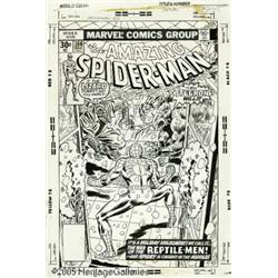 <B>John Romita Sr. - The Amazing Spider-Man #166 Cover Original Art (Marvel, 1977).</B></I> 'Tis the season to be brawling! Writer Len Wein ushers in the yuletide season with a hellacious holiday hoedown between the Wall-Crawler, and two of his reptilian rivals, the Lizard and Stegron. Spider-Man is caught in the middle of "The War of the Reptile-Men!" John Romita Sr. is at the top of his game, with his nice clean action and stunning line work. The image area measures 9.75" x 15". Includes the original title and indicia paste-ups. Some slight staining, otherwise this work is in Excellent condition. If the Lizard and Stegron don't get this Bronze Age bounty, then maybe you will...bid now!
