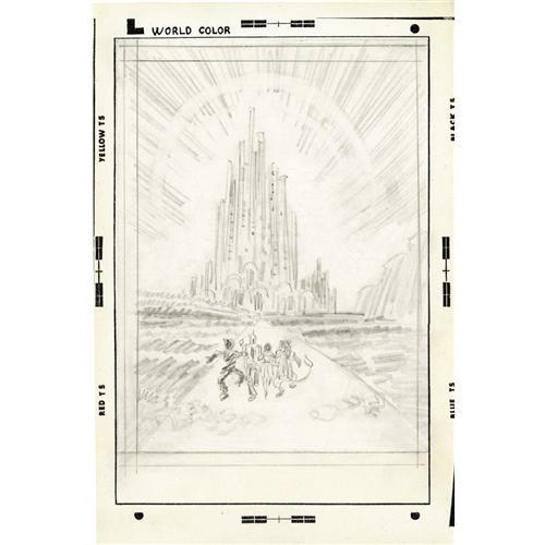 <B>John Romita Sr. - MGM's Marvelous Wizard of Oz #1 Back Cover (Cover 4) Preliminary Original Art (Marvel/DC, 1975).</B></I> The towering spires of Emerald City make for an inspiring sight, as John Romita Sr. choreographs the Scarecrow, the Tin Man, Dorothy, and the Cowardly Lion, as they dance down the Yellow Brick Road. This pencil preliminary has an image area of approximately 10.5" x 14.5", and was drawn on vellum. The drawing has been mounted on a piece of carefully color-matched support paper; otherwise, the art is in Very Good condition.