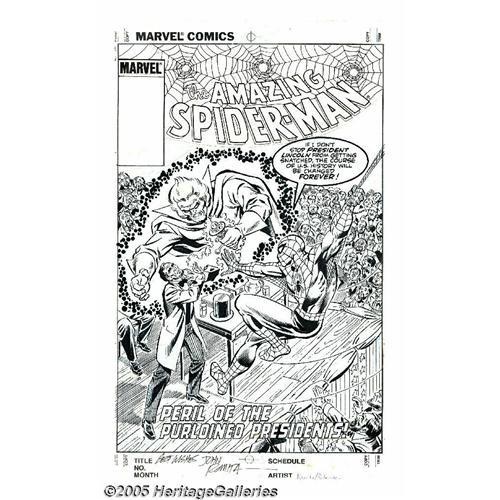 <B>John Romita Sr. and Joe Rubinstein - Unpublished Spider-Man Cover Original Art (circa 1984).</B></I> The Collector has his heart set on adding President Abraham Lincoln to his showroom. Only Spider-Man stands in the way of history being changed forever. A wild and wacky concept, this John Romita Sr. cover never saw print. Unlike many Romita Sr. covers, this one was drawn on comic book cover stock, not vellum. The page has an image area of 9.75"" x 15"" and the art is in Excellent condition. John Romita Sr. signed the art at the lower left. Hang loose, heroes and bid! <BR><BR><B>Important notice:</B> Heritage usually auctions material at the rate of 200-250 lots per hour. On some occasions eBay Live bid software or the Internet may not be able to keep up with the pace of the auction. We recommend placing a realistic absentee bid now as insurance to avoid disappointment. Occasionally the auctioneer may eliminate or reject an eBay Live bid, and the auctioneer may also reopen a lot after the close of the eBay live bidding (usually because we missed an audience bid), and may reject your bid even if it shows you as the winning bidder. By bidding via eBay Live, you agree that Heritage may award the lot to another bidder at its sole discretion under the circumstances described above or any other reasonable circumstances. Since eBay bids are not shown to us until we open the lot on the floor, we treat those bids just like floor bids. In most cases the floor responds before the eBay bid is presented to us, due to Internet lag time, so for consistency we have made it a policy that floor bids are always considered first over tie eBay live bids. Also please note that all Heritage lots purchased through eBay Live carry a 20% Buyer's Premium. Please make sure you read the Terms and Conditions before you bid. This lot is being auctioned in conjunction with a live floor auction by Heritage Galleries & Auctioneers. All final auction and invoice information will be supplied by Heri