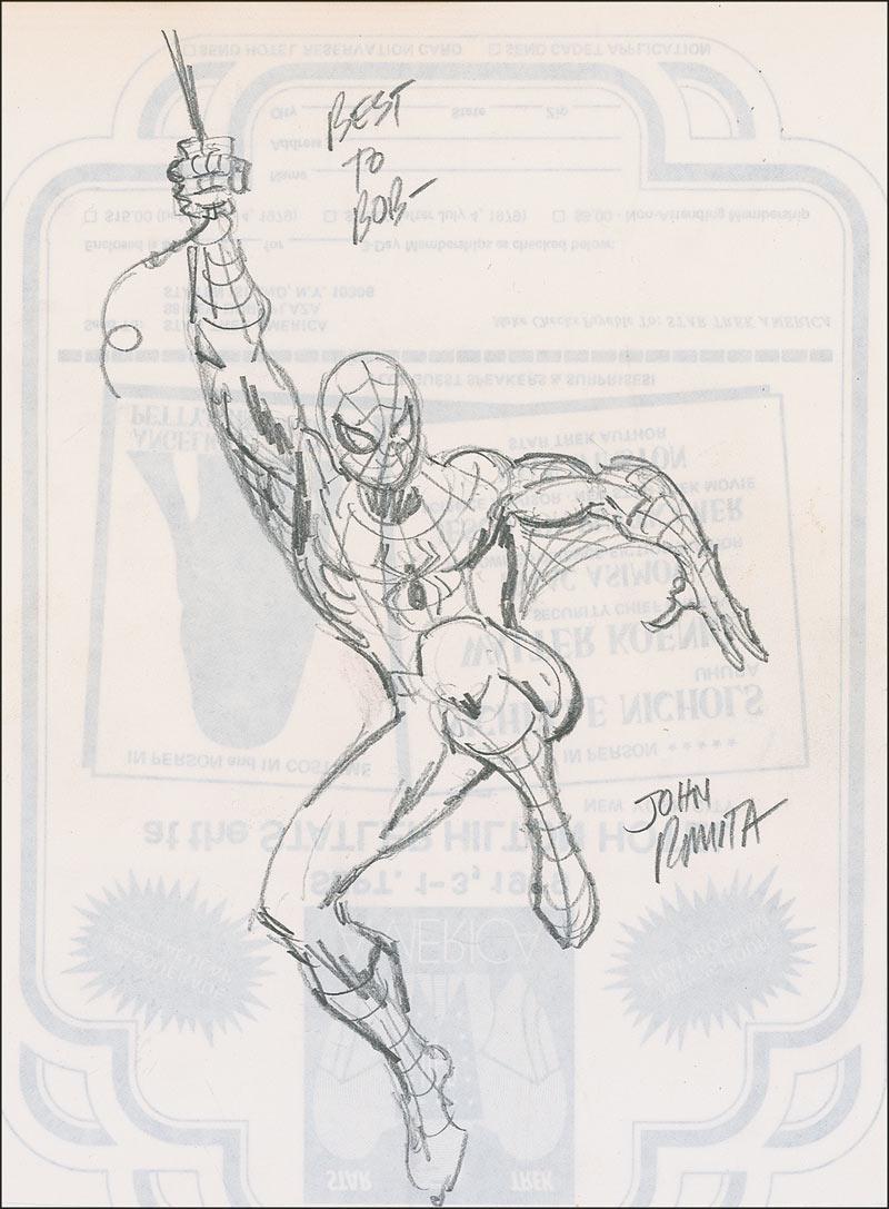 Original signed pencil sketch of Spider-Man on an off-white 7.5 x 10 sheet (the reverse of a Star Trek convention flyer), signed “Best to Bob—John Romita.” In fine condition, with light toning along the top edge and show-through from the printed side.