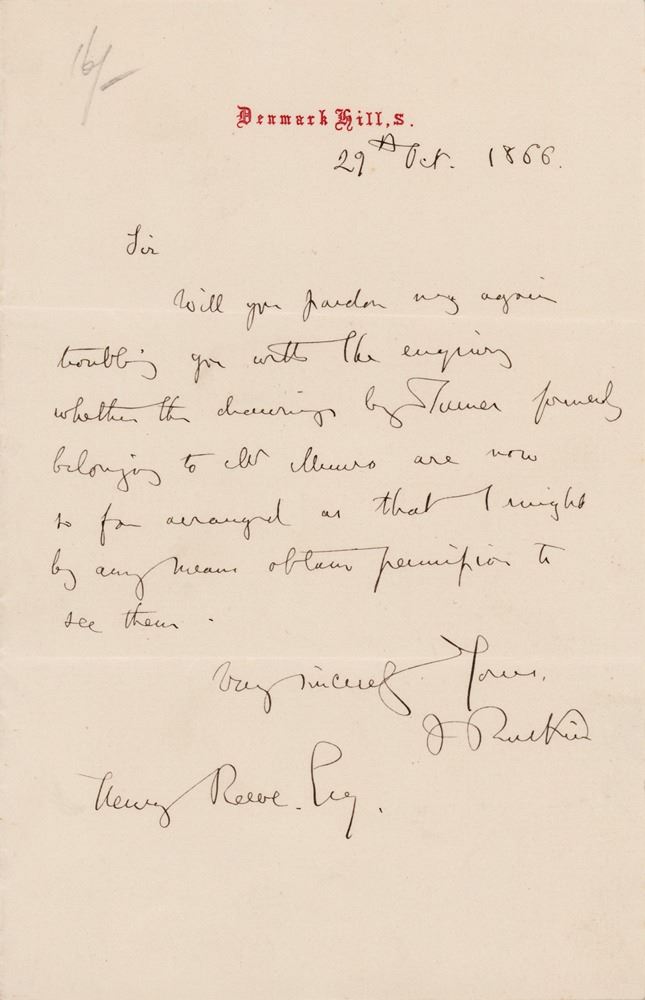 ALS signed "J. Ruskin," one page, 4.5 x 7, Denmark Hill letterhead, October 29, 1866. Handwritten letter to Henry Reeve, in full: "Will you pardon my again troubling you with the enquiry whether the drawings by Turner formerly belonging to Mr. Munro are now so far arranged as that I might by any means obtain permission to see them." In fine condition.