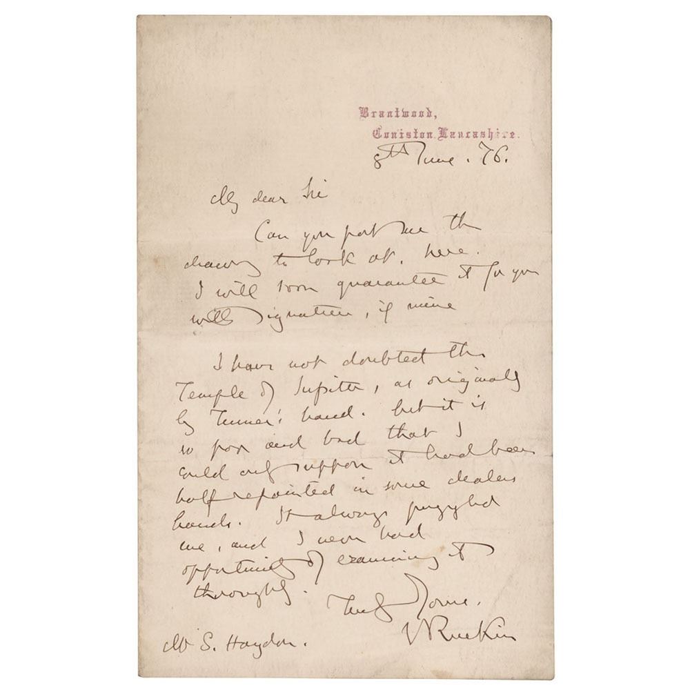 ALS signed “J. Ruskin,†one page, 4.5 x 7, Brantwood letterhead, June 8, 1876. Handwritten letter to Mr. S. Hayden, in full: "Can you post me the drawing to look at, here. I will soon guarantee it for you with signature, if mine. I have not doubted the Temple of Jupiter, as originally by Turner's hand. But it is so poor and bad that I could only suppose it had been half repainted in some dealer's hands. It always puzzled me, and I never had opportunity of examining it thoroughly." In fine condition, with light soiling.