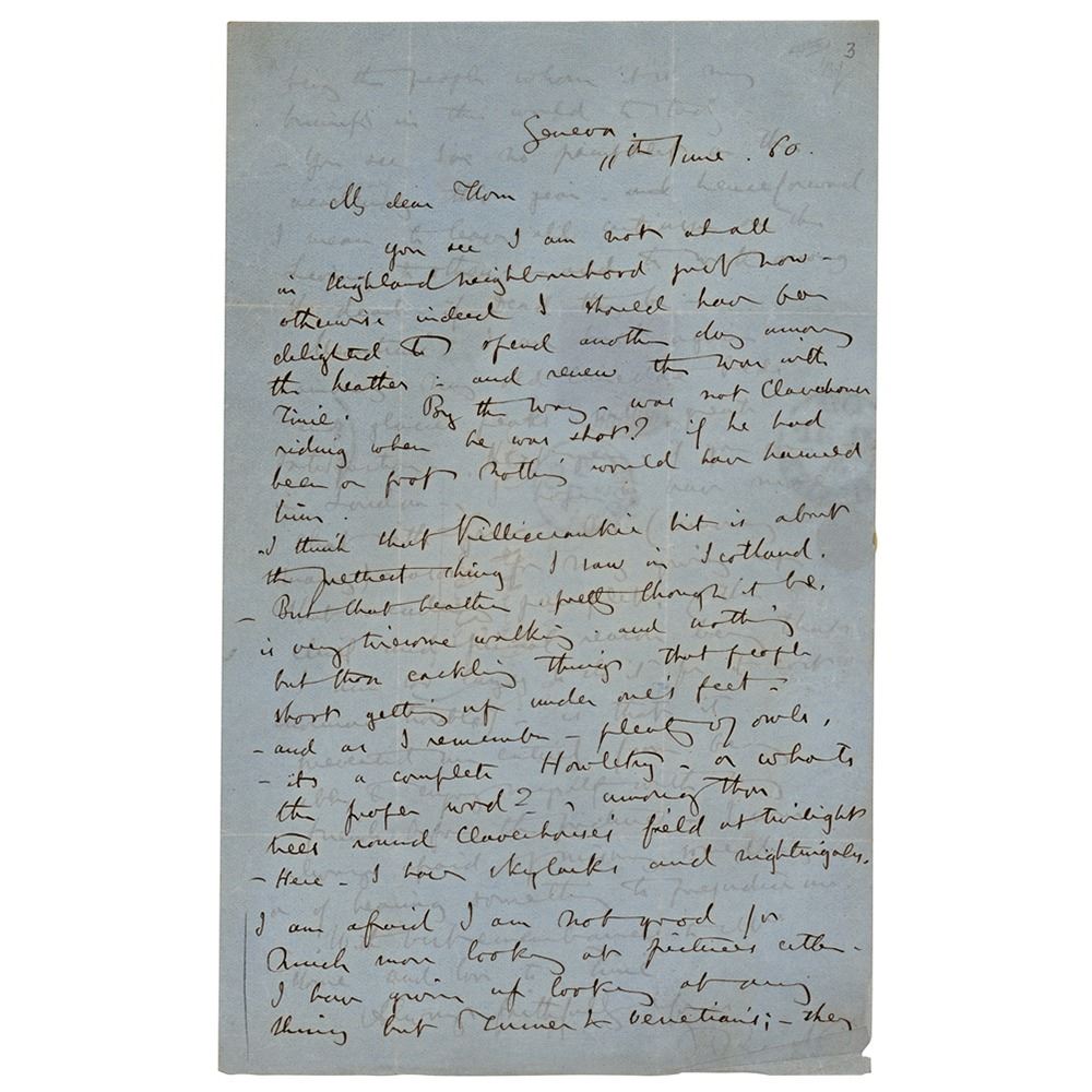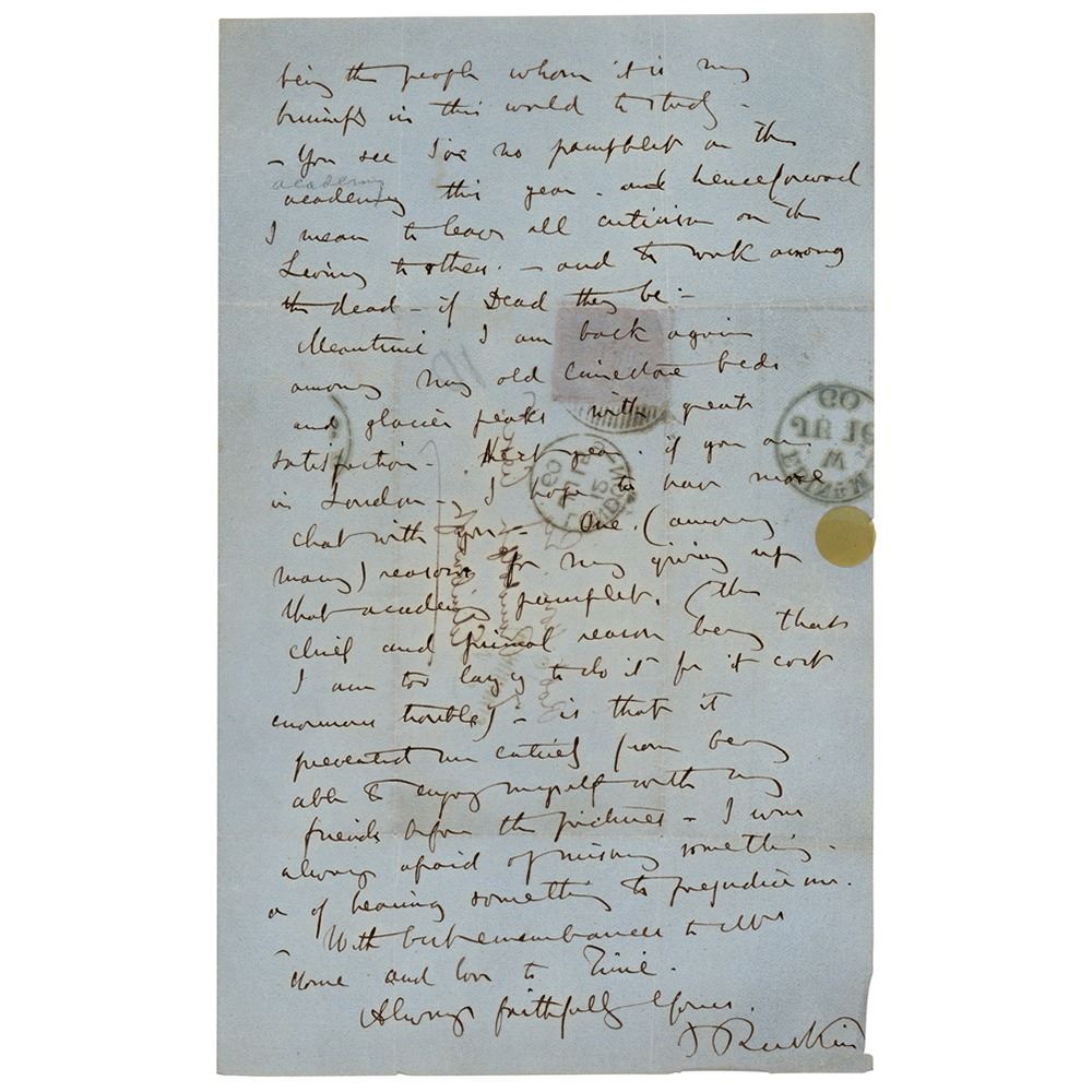 ALS signed “J. Ruskin,†two pages on two adjoining sheets, 5 x 8.25, June 11, 1860. Handwritten letter to a gentleman in Edinburgh, written from Geneva. In part: "You see I am not at all in Highland neighborhood just now—otherwise indeed I should have been delighted to spend another day among the heather…I think that Killiecrankie bit is about the prettiest thing I saw in Scotland—but that heather, pretty though it be, is very tiresome walking…I am afraid I am not good for much more looking at pictures either. I have given up looking at any thing but Turner & Venetians:—they being the people whom it is my business in this world to study." In fine condition, with light overall wrinkling and a small circular adhesive remnant to the second page.