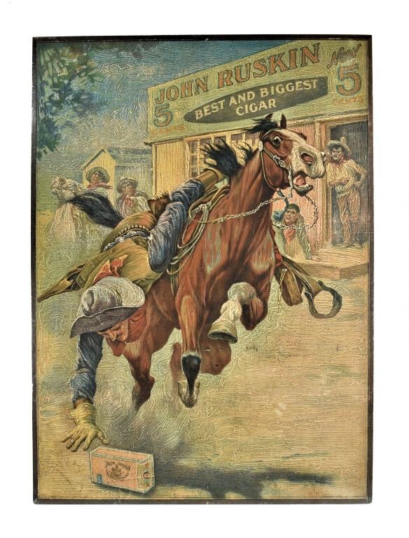 John Ruskin Best and Biggest Cigar Embossed Cardboard Sign. Couple perimeter pin holes otherwise very good original condition. 19 X 26 inches.