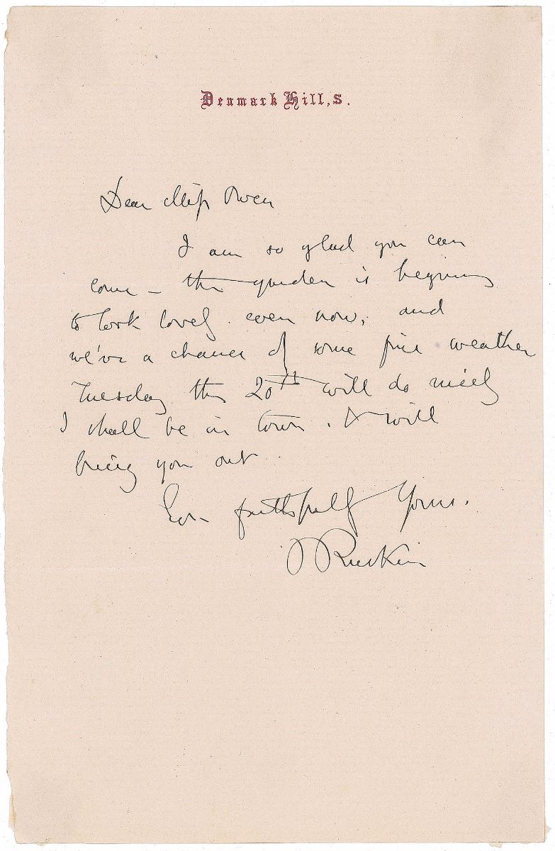 Influential English art critic and writer (1819–1900). ALS signed “J. Ruskin,” one page, 4.5 x 7, Denmark Hill letterhead, no date. In part: “I am so glad you can come—the garden is beginning to look lovely even now, and we’ve a chance of some fine weather.” In fine condition, with light wrinkling to the corners from old mounting remnants on the reverse.