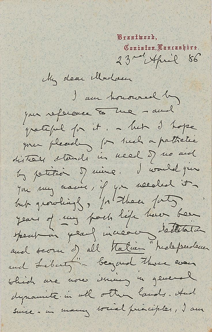 ALS, three pages on two adjoining sheets, 4.5 x 7, Brantwood letterhead, April 23, 1886. In part: "I am honoured by your reference to me—and grateful for it,—but I hope your pleading for such a pathetic distress stands in need of no aid by petition of mine. I would give you my name, if you needed it—but growlingly, for these forty years of my poet life have been spent on yearly increasing detestation and scorn of all Italian 'Independence and Liberty'—beyond those even which are now issuing in general dynamite in all other lands." In fine condition.