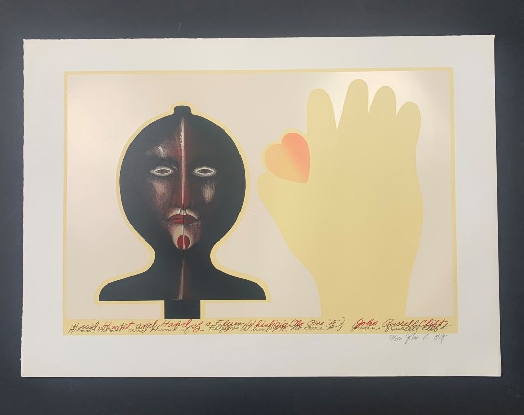 John Russell Clift's "Head, Heart and Hand of a Flyer" limited edition print, signed and numbered 32/250 lower right. This piece does have a small divit in the middle of the print, otherwise in great condition