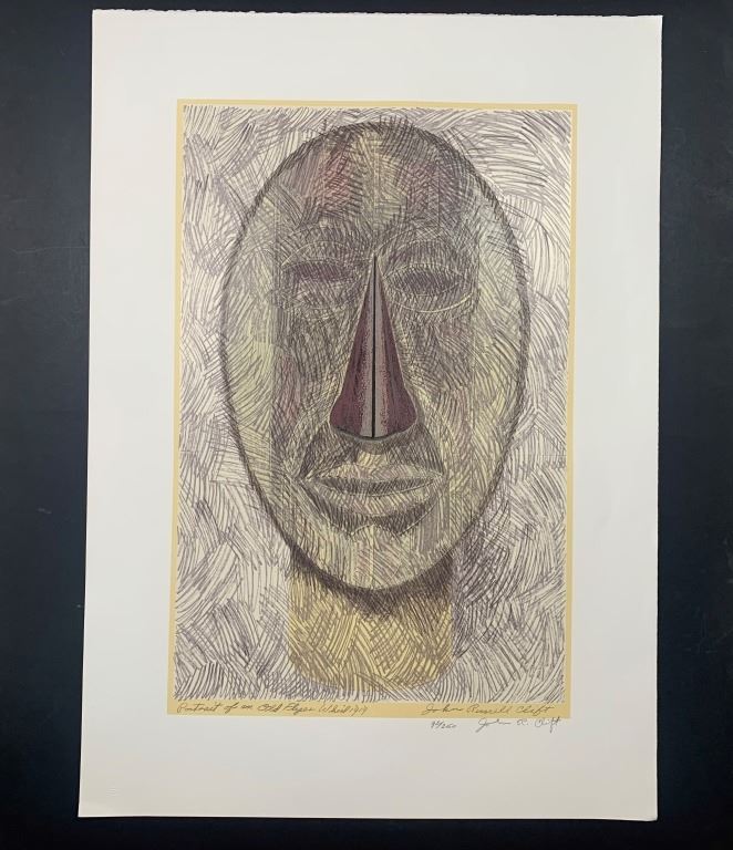 John Russell Clift's "Portrait of an Old Flyer Whirl" limited edition print, signed and numbered lower right 92/250. This piece is in good to great condition, as there are a few very minor wrinkles, and very minor corner folds at bottom.