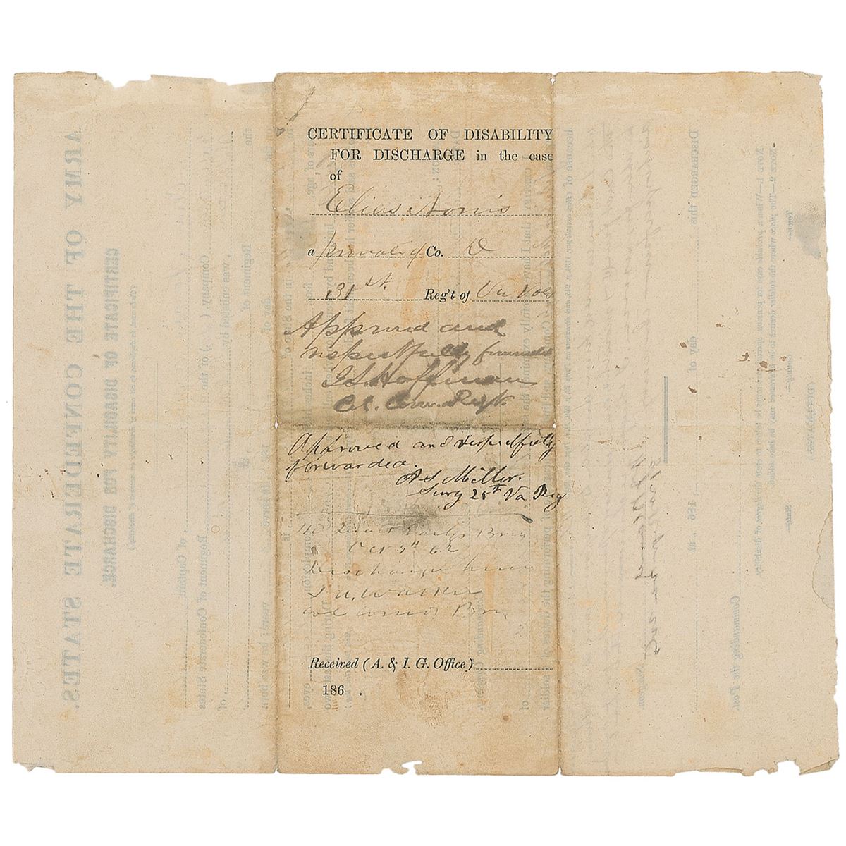 Confederate colonel (1821–1877) who served at Gettysburg and was severely wounded at Hatcher's Run in February 1865. Civil War–dated handwritten endorsement, “Approved and respectfully forwarded, J. S. Hoffman, Col. Com. Regt.,” penned on the reverse docketing panel of a Confederate certificate of disability for discharge, one page, 8 x 9.25, September 26, 1862. The certificate discharges Elias Norris from service due to rheumatism that had prevented him from performing any duty for over five months. In very good condition, with intersecting folds, moderate soiling, chips to edges, and some spreading to ink in Hoffman’s endorsement.