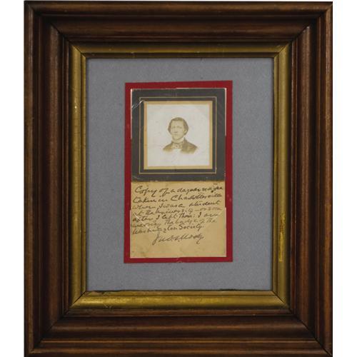 <B>John S. Mosby Image With Autograph Note Signed,</B></I> "<I>Jno. S. Mosby</B></I>". This unique pairing consists of an albumen print, 4" x 3.75", framed with an explanatory note in Mosby's hand measuring 3.75" x 3". It reads, "<I>Copy of a daguerreotype taken in Charlottesville when I was student at the University - or soon after I left there: I am wearing the badge of the Washington Society.</B></I>" Both items are matted and framed to an overall size of 12" x 14". Light aging and stains, else good condition. Confederate Colonel John Singleton Mosby won enduring fame by raiding deeply into Federal-held territory from early 1863 until war's end. A lawyer by trade, Mosby had attended the University of Virginia until being expelled for shooting another student!<BR><BR><b>Shipping:</b> Framed (<a target="_blank" href="http://www.heritageauctions.com/common/shipping.php">view shipping information</a>)