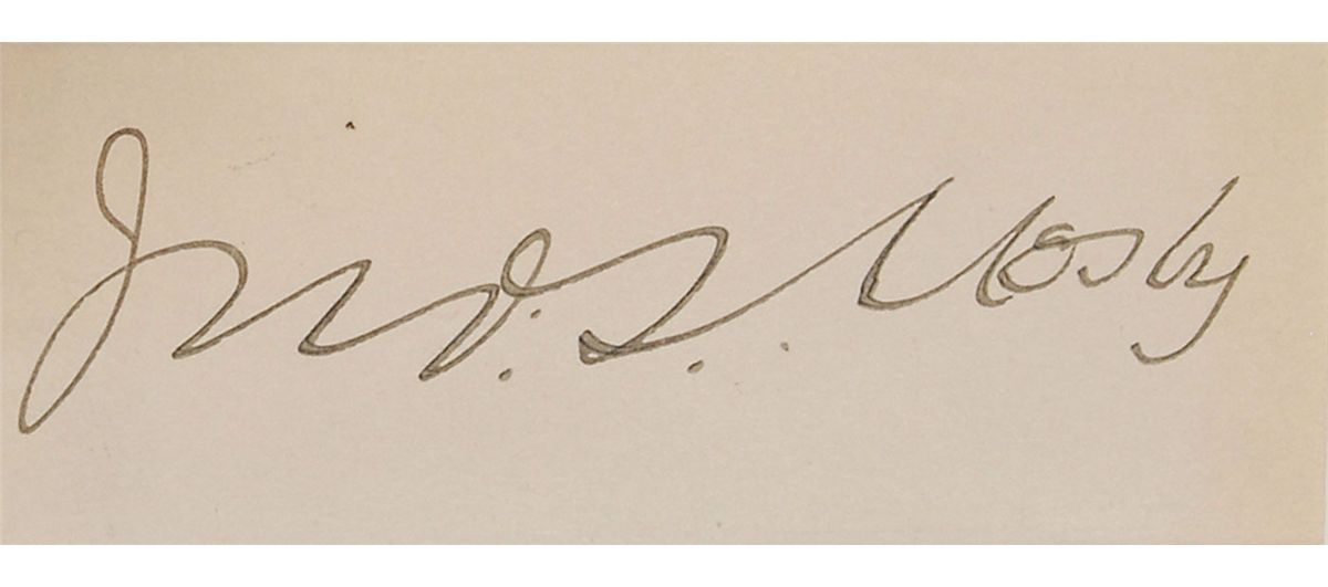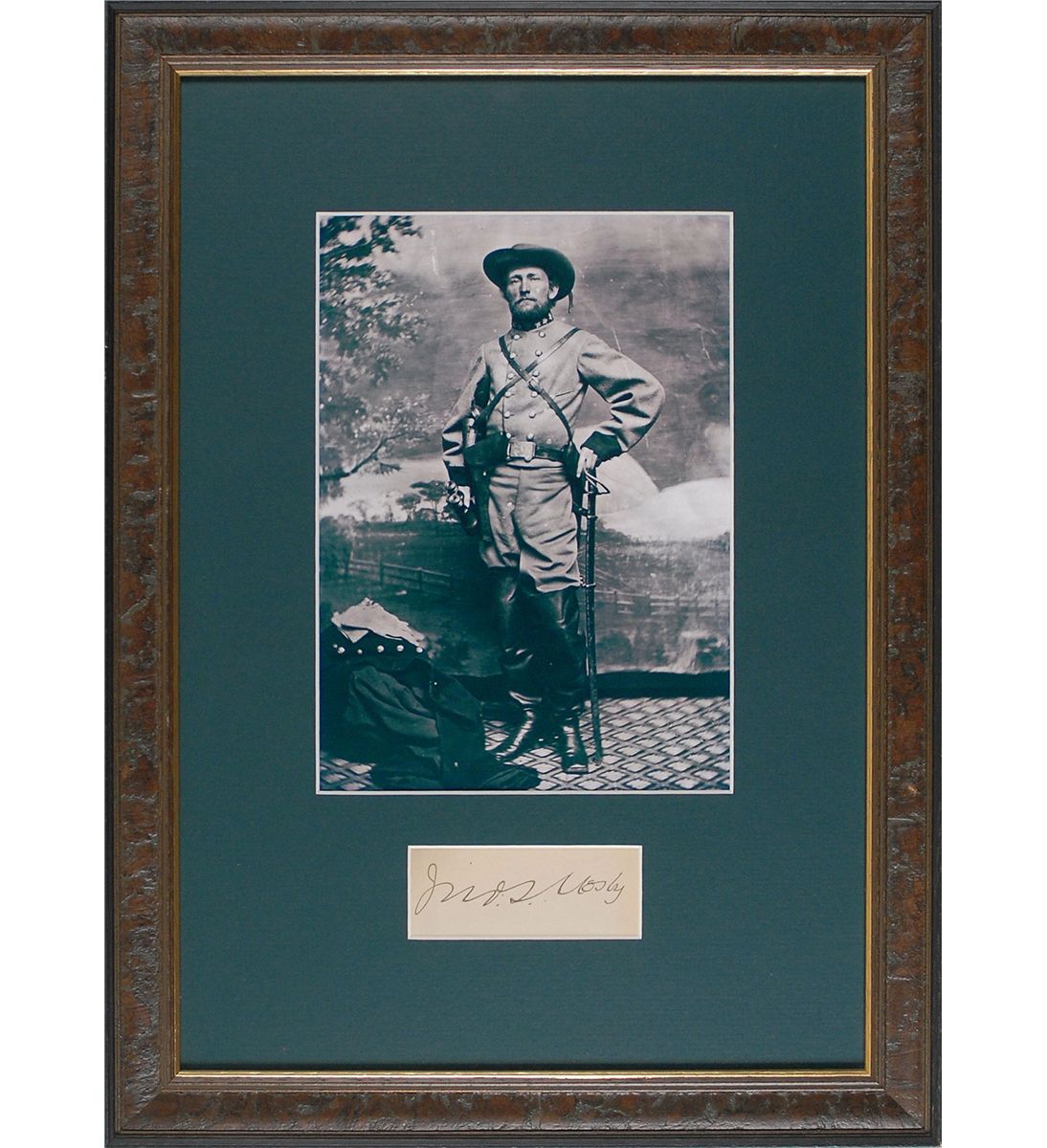 Confederate ranger (1833–1916) whose guerrilla band specialized in attacking and disrupting Union supply lines. He earned the nickname ‘The Gray Ghost’ for his clandestine and highly effective attack tactics. Ink signature, “Jno. S. Mosby,” on an off-white 4 x 1.5 slip. Handsomely matted and framed with a large image to an overall size of 14 x 19.5. In fine condition.
