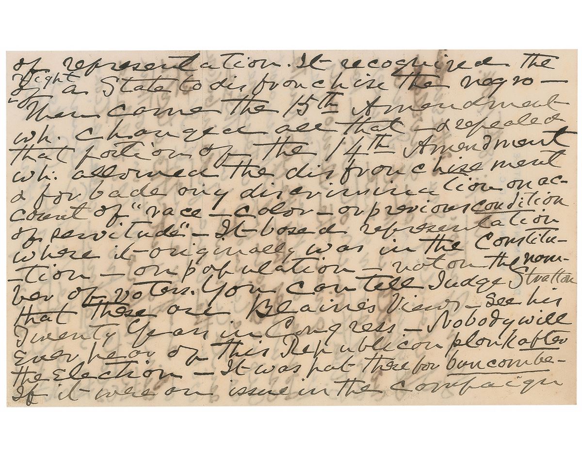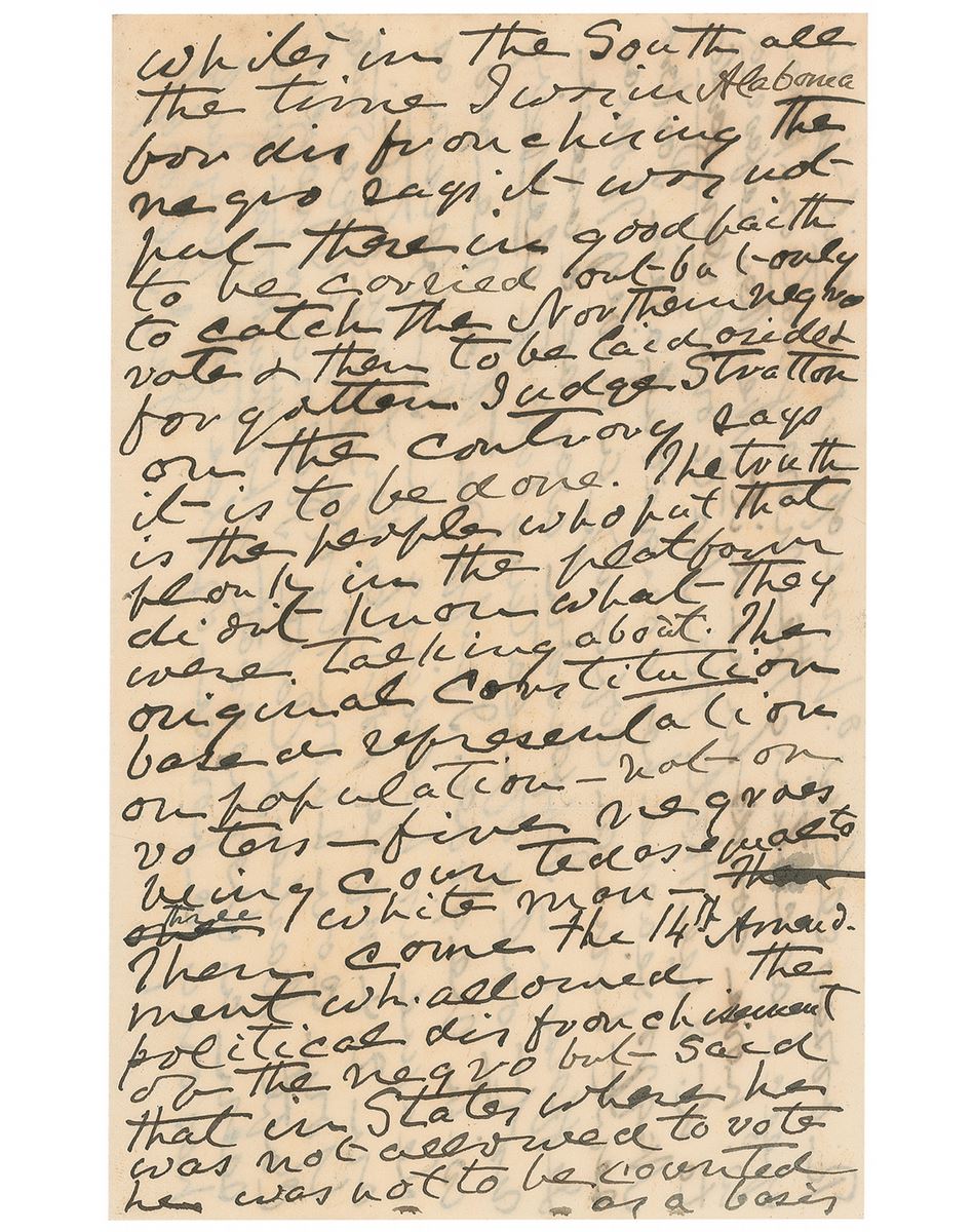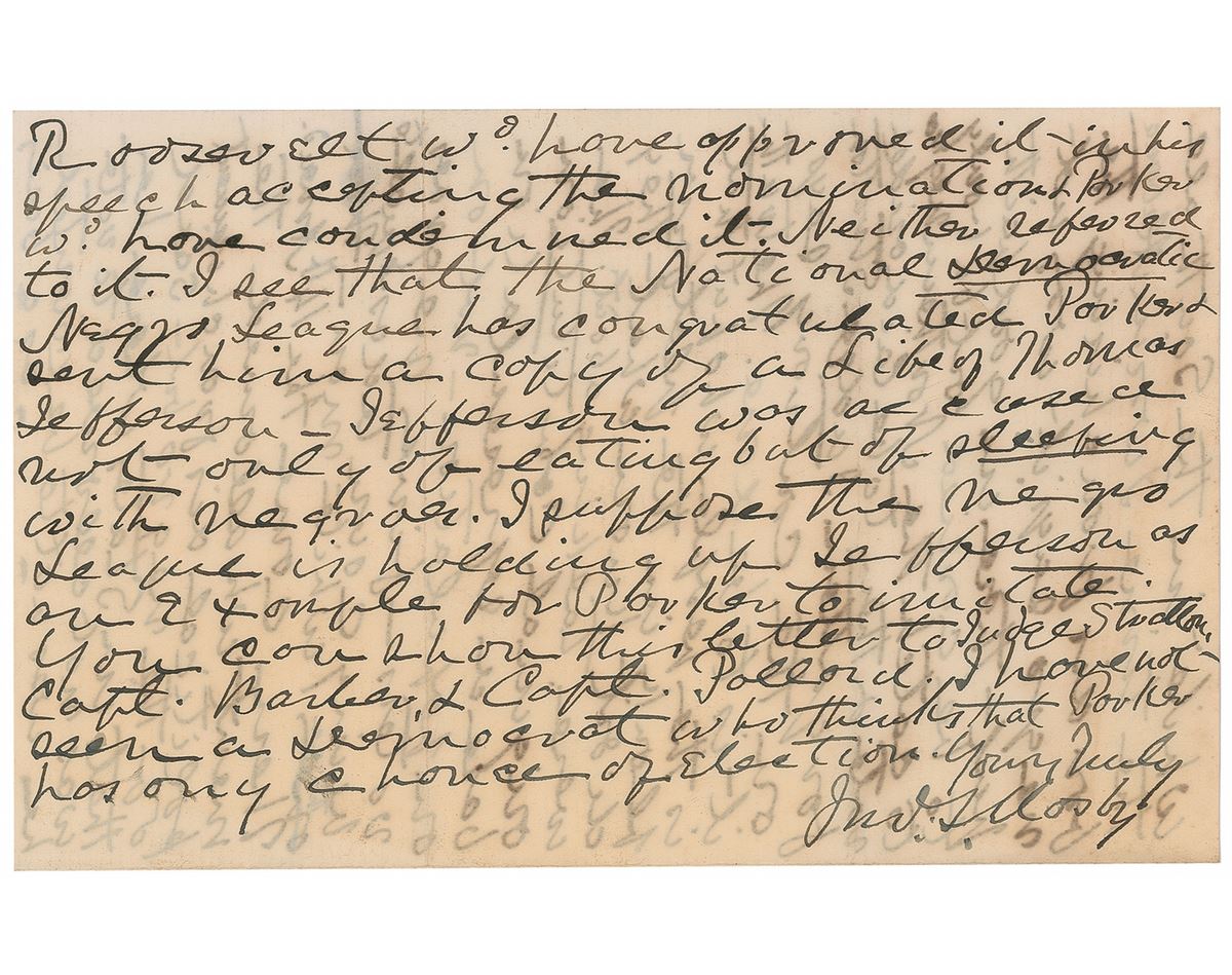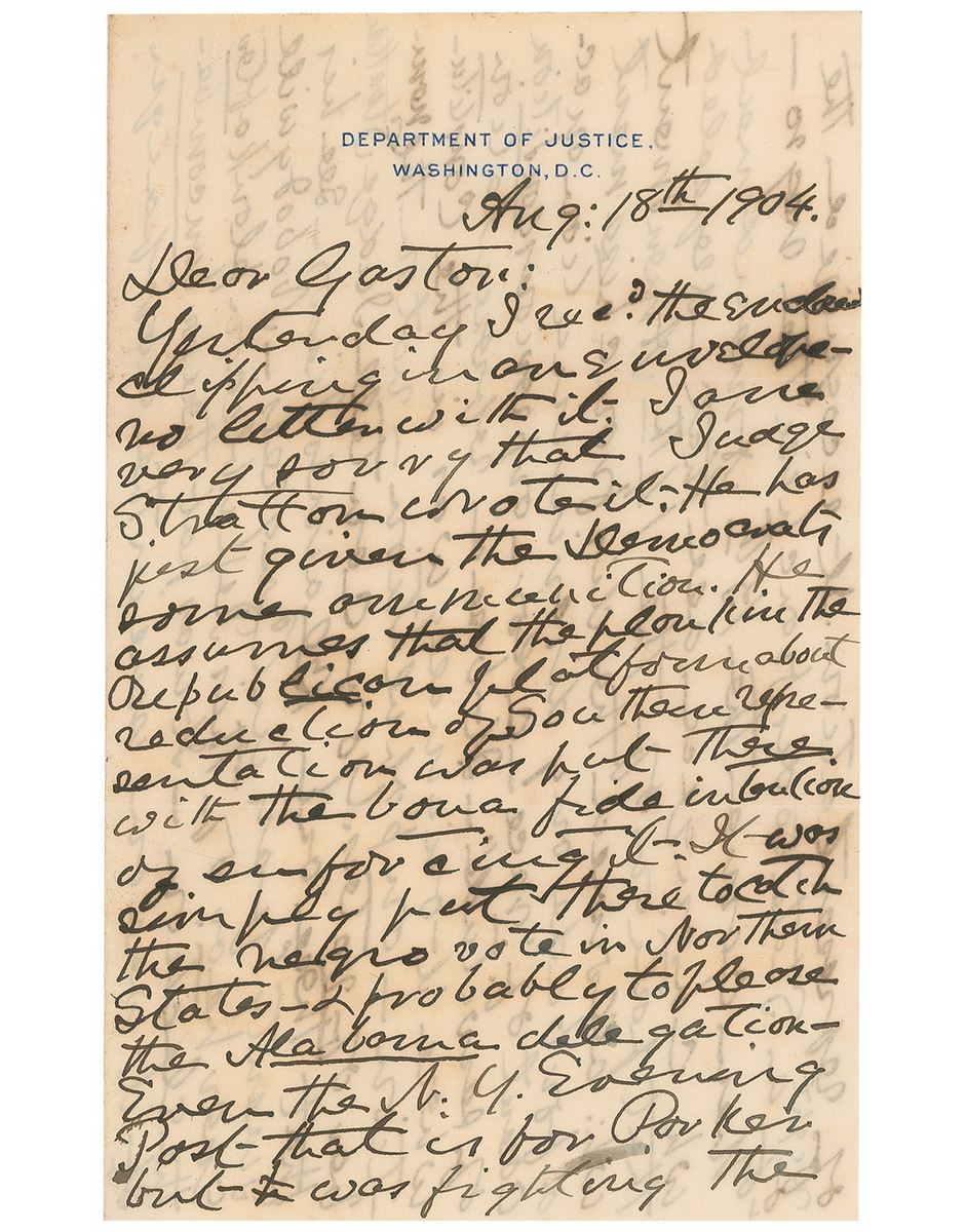 ALS signed “Jno. S. Mosby,” four pages on two adjoining sheets, 4.75 x 7.75, Department of Justice letterhead, August 18, 1904. Letter concerning the presidential election of 1904 between Teddy Roosevelt and Alton Parker. In part: “Judge Stratton…has just given the Democrats some ammunition. He assumes that the plank in the Republican platform about reduction of Southern representation…was simply put there to catch the Negro vote in the Northern States…fighting the Whites in the South…the people who put that plank in the platform did not know what they were talking about. The original Constitution based representation on population—not on voters—five Negroes being counted as three white men…Nobody will ever hear of this Republican plank after the election. It was put there for buncombe—if it were an issue in the campaign Roosevelt would have approved it in his speech accepting the nomination…I see the Nat. Dem. Negro League has congratulated Parker & sent him a copy of the Life Of Thomas Jefferson—Jefferson was accused of not only eating but of sleeping with Negroes. I suppose the Negro League is holding up Jefferson as an example for Parker to imitate.” In fine condition, with moderate show-through from writing to opposing sides.