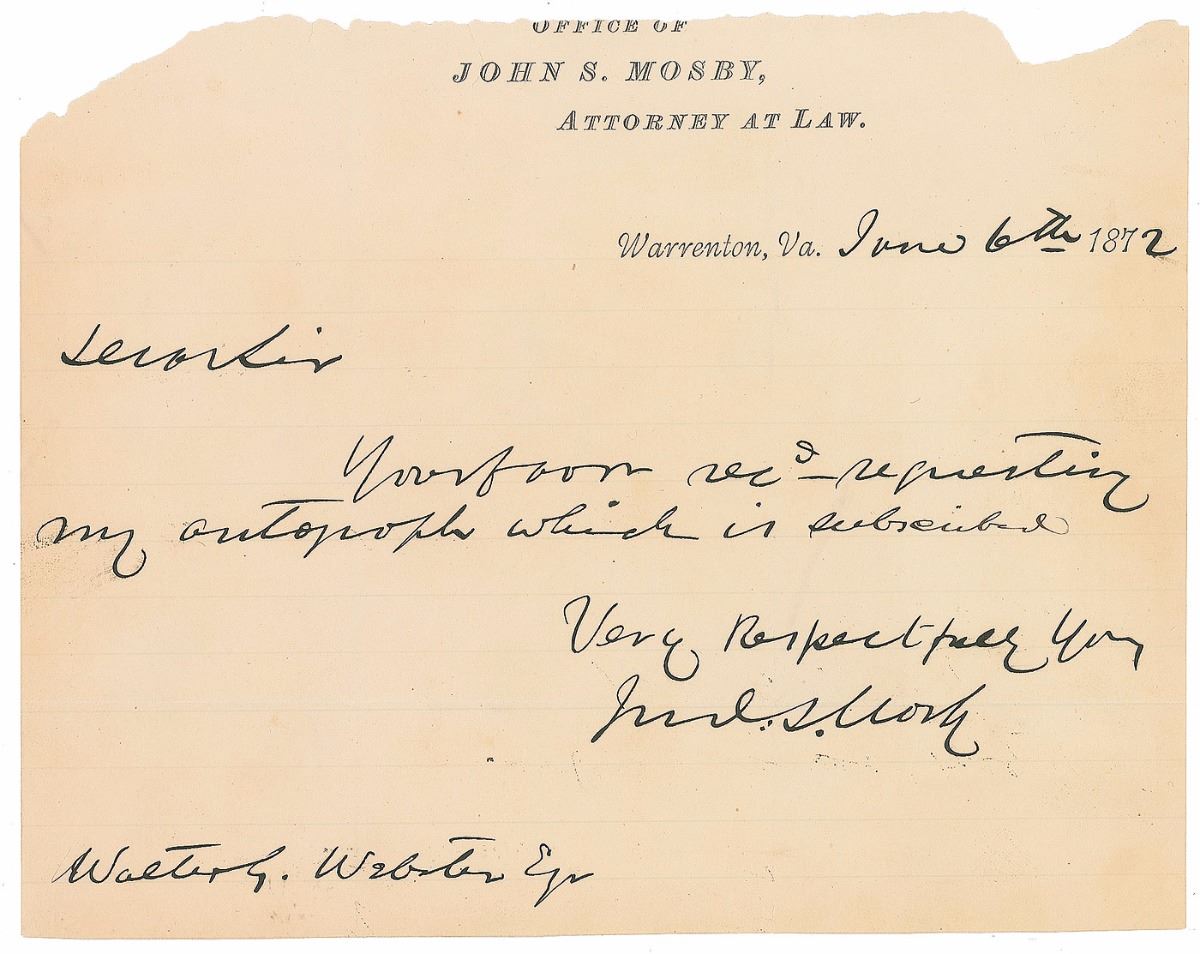 ALS signed “Jno: S. Mosby,” one page, lightly-lined, 8 x 6.25, personal letterhead, June 6, 1872. Letter to Walter Webster, in full: “Your favor rec’d—requesting my autograph which is subscribed.” In fine condition, with trimming to the top edge.