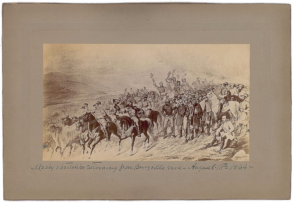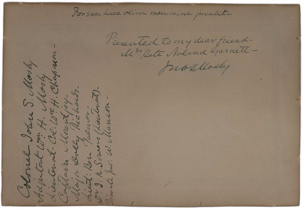 Wonderful vintage 7.25 x 4 albumen print of French artist Charles Edouard Armand-Dumaresq's 1868 painting of Mosby's Rangers returning from their great Berryville wagon train raid, affixed to its original 10.25 x 7 mount, annotated on the mount by Mosby in black ink, "Mosby's battalion returning from Berryville raid—August 13th 1864—." On reverse of mount, Mosby signs his name, "Colonel John S. Mosby," and then proceeds to list seven of his famed Rangers: "Adjutant Wm. H. Mosby, Lieutenant Col. Wm. H. Chapman," "Captain Mountjoy, Major Dolly Richards, Lieut: Ben Palmer, Dr. J. R. Sowers (Lieutenant), Private Jno: W. Munson." Furthermore, along the right side, Mosby adds a signed inscription, "Presented to my dear friend—Mrs. Kate Noland Garnett—Jno. S. Mosby," and above, "Forsan et haec olim meminisse juvabit," which translates to 'A joy it will be one day, perhaps, to remember even this.' In fine condition, with slightly trimmed edges. A tremendous piece signed multiple times by its very subject.