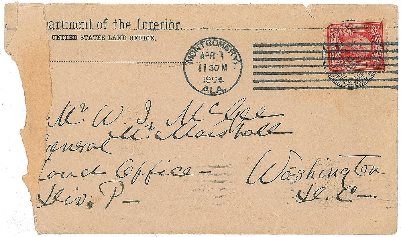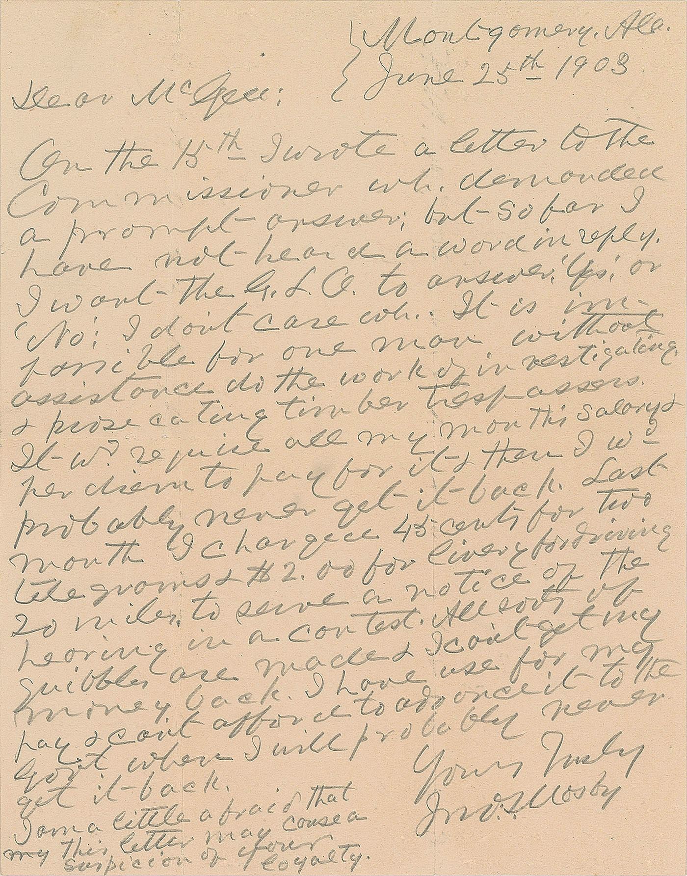 ALS in pencil, signed “Jno. S. Mosby,” one page, 7.75 x 10, June 25, 1903. From Montgomery, Alabama, Mosby writes to W. I. McGee at the General Land Office in Washington, DC. In full: "On the 15th I wrote a letter to the Commissioner wh[ich] demanded a prompt answer, but so far I have not heard a word in reply. I want to G.L.O. to answer, 'Yes,' or 'No:' I don't care wh[ich]. It is impossible for one man without assistance [to] do the work of investigating, & prosecuting timber trespassers. It w'd require all my month's salary & per diem to pay for it & then I w'd probably never get it back. Last month I charged 45 cents for two telegrams & $2.00 for livery for driving 20 miles, to serve a notice of the hearing in a contest. All sorts of quibbles are made & I can't get my money back. I have use for my pay & can't afford to advance it to the Gov't when I will probably never get it back. I am a little afraid that this letter may cause a suspicion of your loyalty." In fine condition. Accompanied by the original mailing envelope addressed in Mosby's hand. In 1901, Mosby became a special agent for the General Land Office, on the trail of illegal ranch land fencers and timber trespassers in Colorado, Nebraska, and Alabama. An interesting letter from late in the intrepid Confederate ranger's post-war career.
