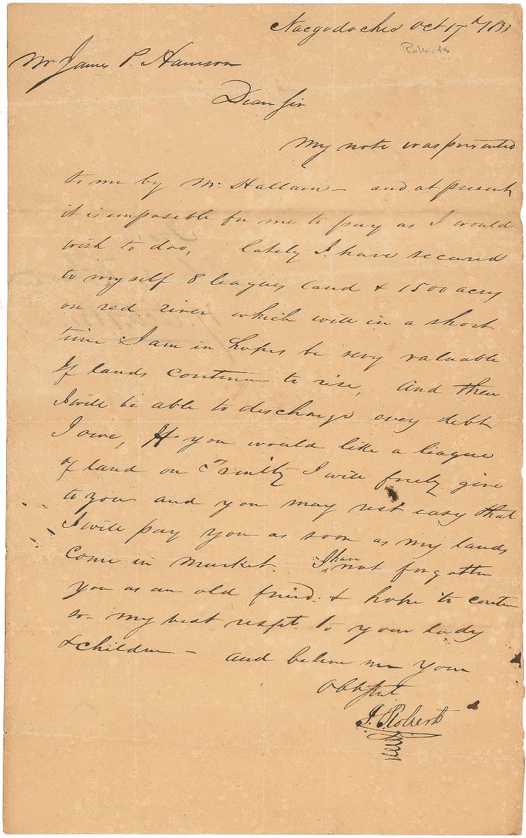 Merchant and politician (1796–1871) who signed the Texas Declaration of Independence on March 2, 1836. ALS signed “J. Roberts,” one page, 7.75 x 12.5, October 17, 1833. Letter to James P. Harrison, in part: “My note was presented to me by Mr. Hallain—and at present it is impossible for me to pay as I would wish to do. Lately I have secured to myself 8 leagues land & 1500 acres on red river which will in a short time I am in hopes be very valuable if lands continue to rise, and then I will be able to discharge every debt I owe. If you would like a league of land…I will freely give to you and you may rest easy that I will pay you as soon as my lands come in market. I have not forgotten you as an old friend & I hope it continues so.” Docketed on the reverse in another hand. Intersecting folds (one vertical fold passing through the last two letters of the signature) and a few small blots of ink, otherwise fine condition. Provenance: The Robert Davis Collection.