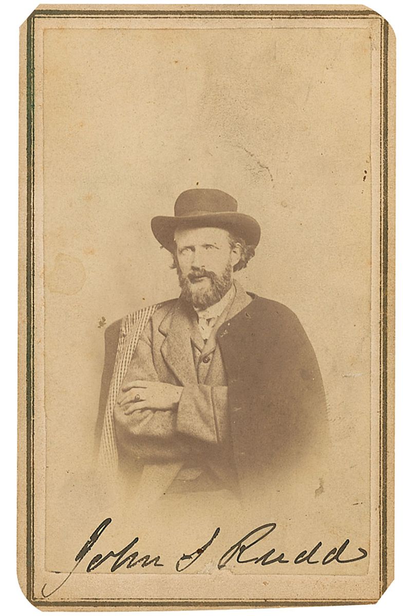 Original 2.25 x 4 carte-de-visite photo of Rudd in his overcoat and hat by Bath and Mann, signed below the image in black ink, “John S. Rudd.” Clipped corner tips and scattered light soiling and spotting to image, otherwise fine condition.