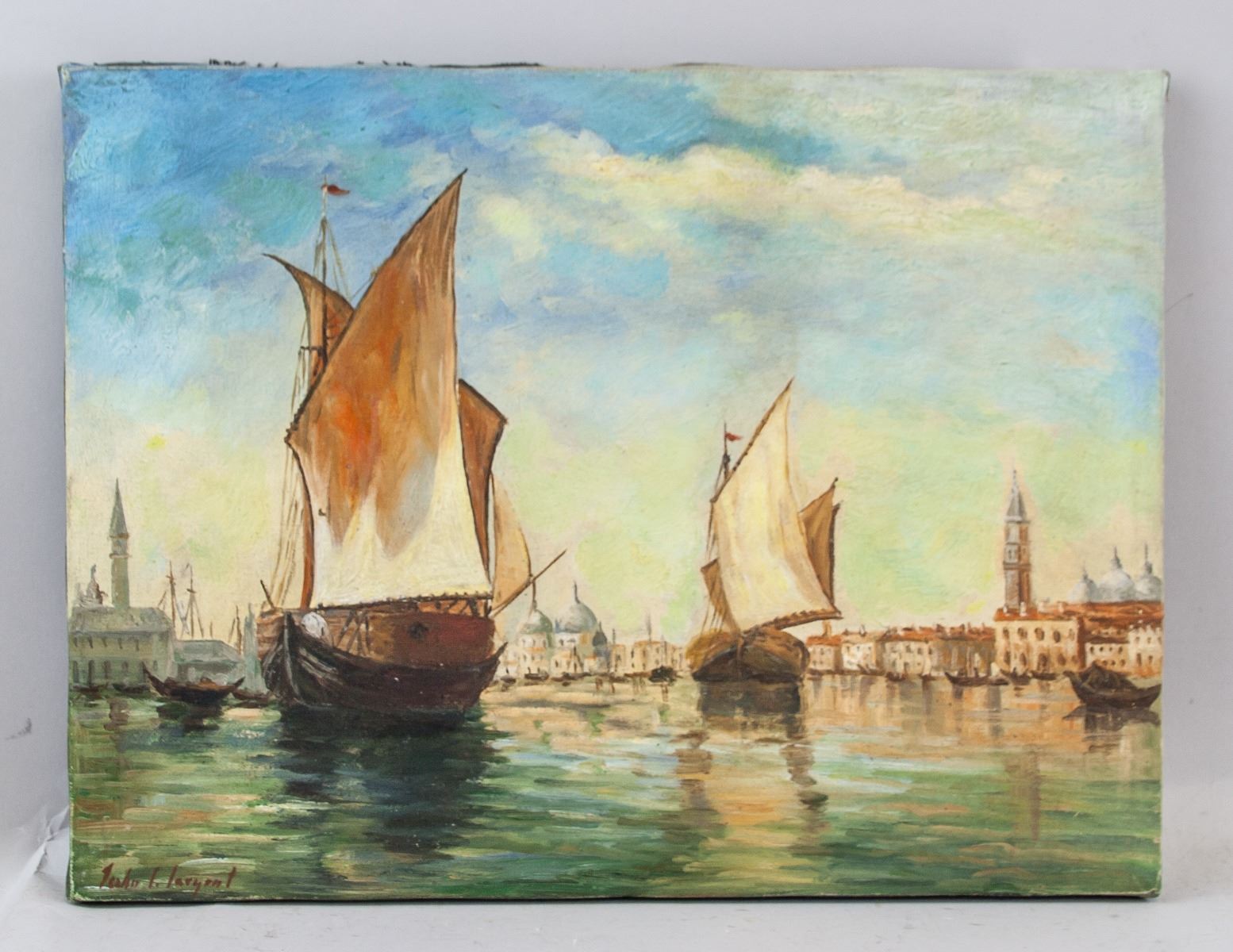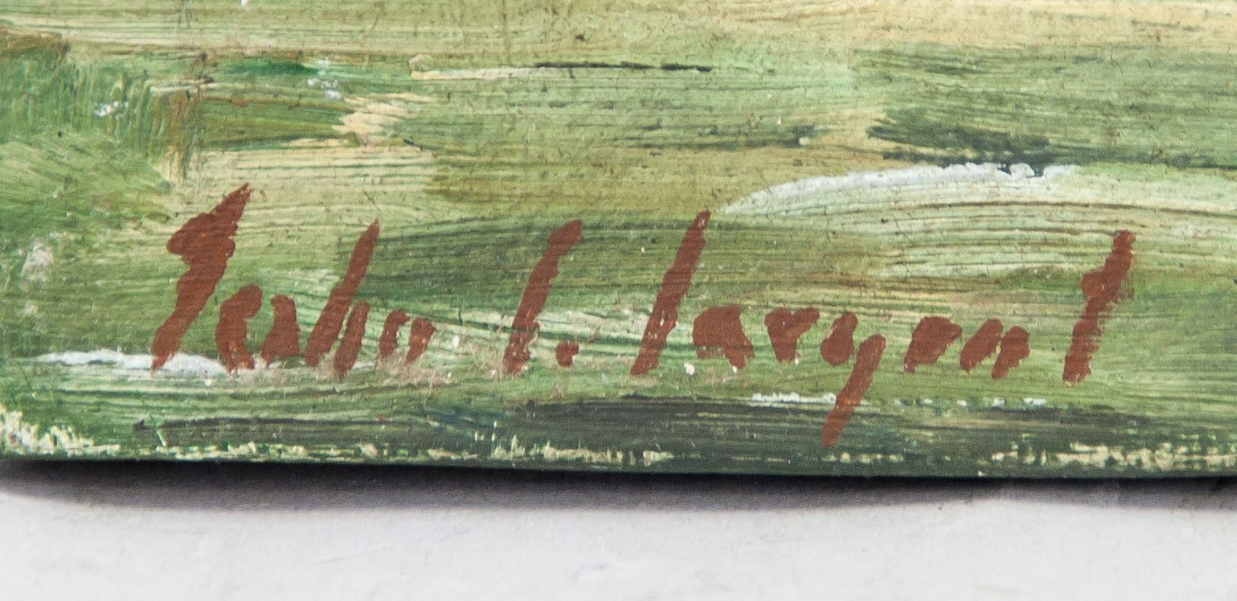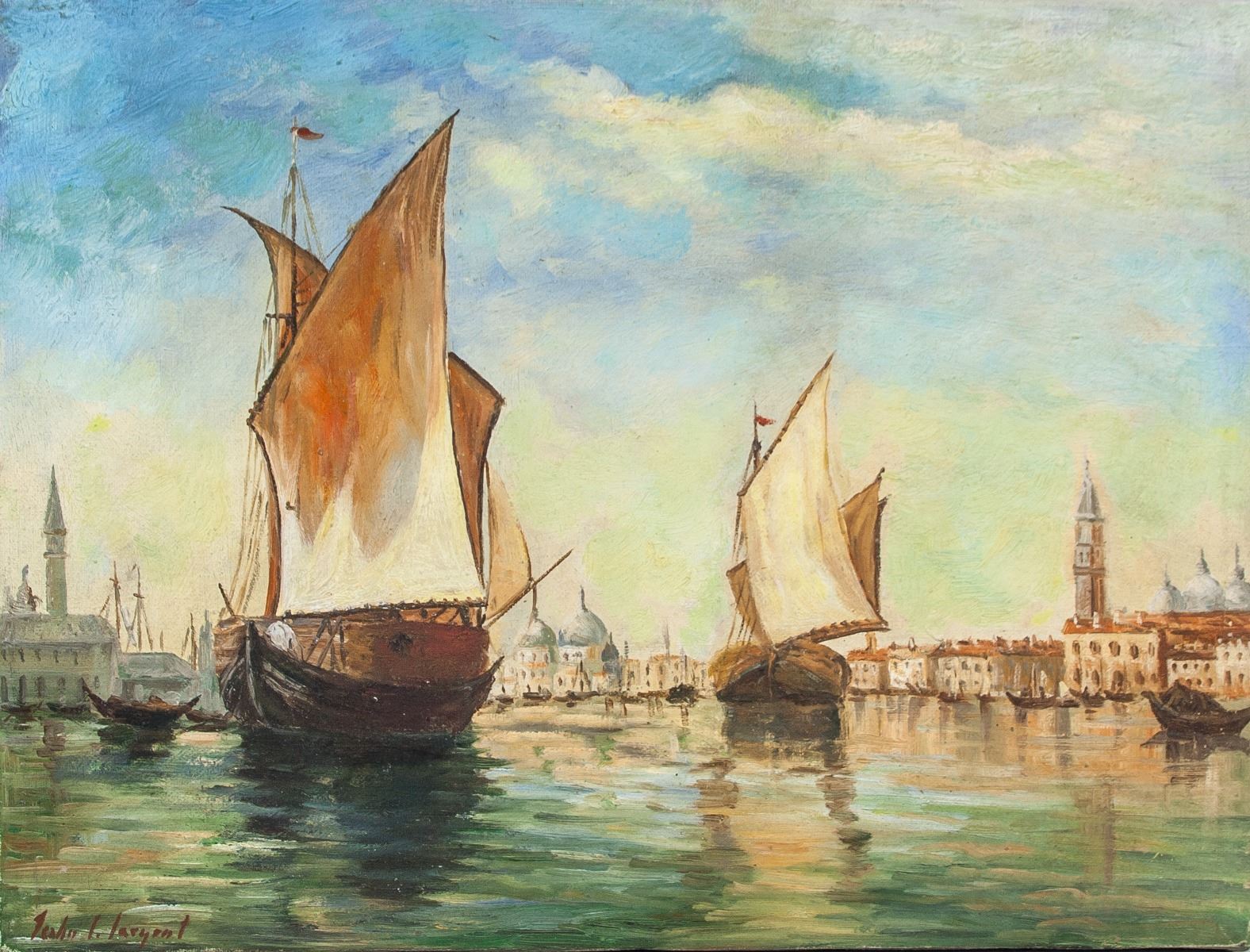 Oil on stretched canvas, American Renaissance School, featuring harbor and ships, signed John S Sargent, possible signature of John Singer Sargent on the lower left corner. Verso inscribed Lch-437. 31 x 41 cm (12.2 x 16.1 inches). PROVENANCE: Private American estate