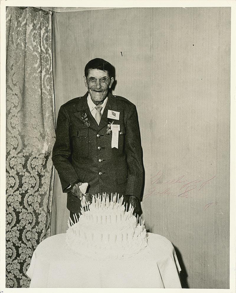 Salling (1858–1959) long claimed to be the second-oldest surviving Confederate veteran. His claim, including a birth date of 1846, remained in the Guinness Book of World Records until 2006, by which time further research established his true age and failed to turn up any record of military service. Vintage matte-finish 8 x 10 photo of Salling posing with a heavily candle-laden birthday cake, signed in red ballpoint “Greetings of John Salling.” Salling has also signed and inscribed on the reverse, “To Jimmie Ray, Greetings from Gen. John Salling, Conf. Veteran, 109 years young.” In very good condition, with signature on front rather light but generally legible (irregular ink flow resulting in several “dropped” letters to last name), a few small creases, and scattered ink marks and light soiling to reverse (lightly touching signature).