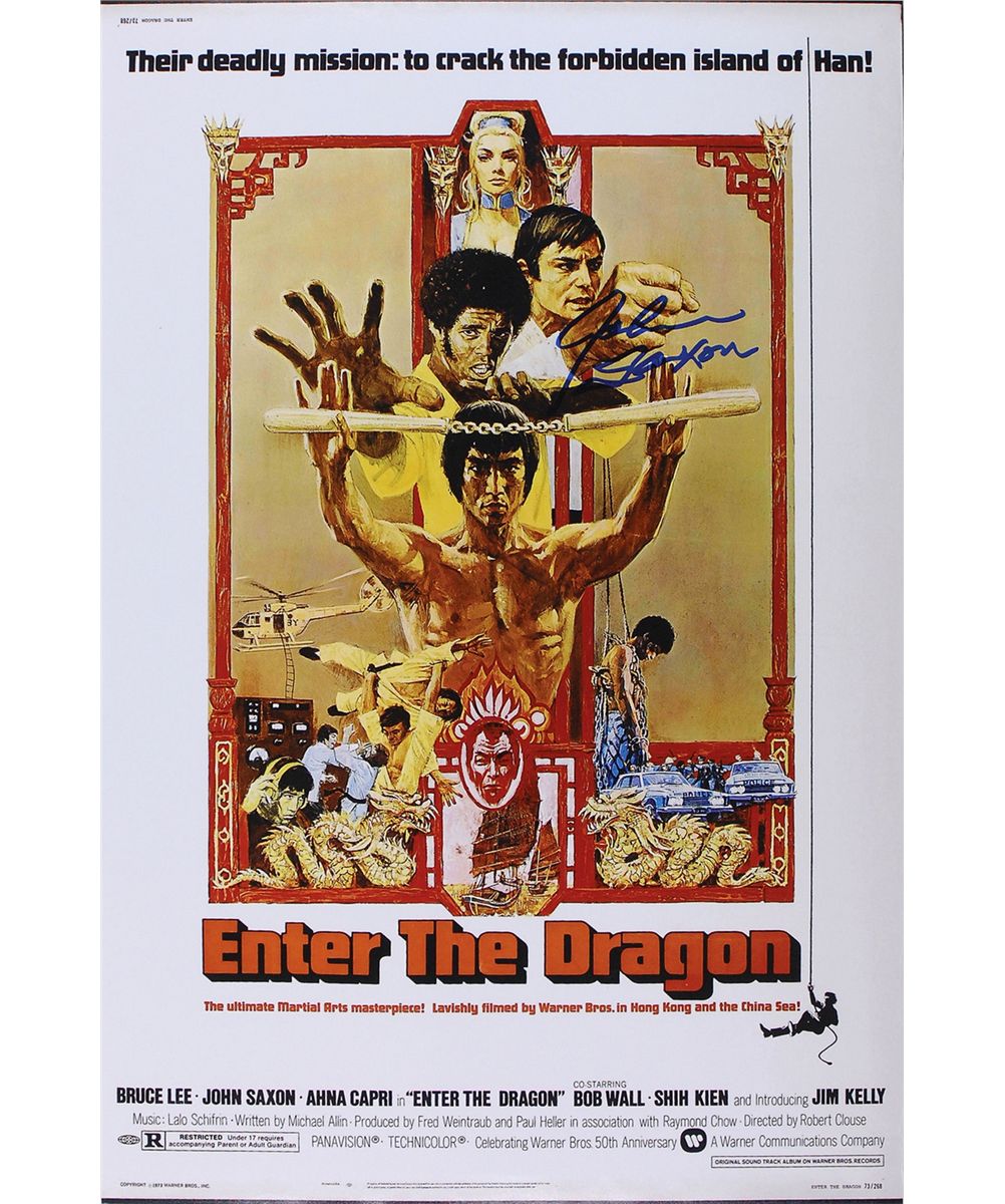 Color satin-finish 12 x 17.75 photo of a movie poster for Enter the Dragon, signed in person in blue felt tip. In very fine condition. Originally obtained by in-person specialist Mike Wehrmann.