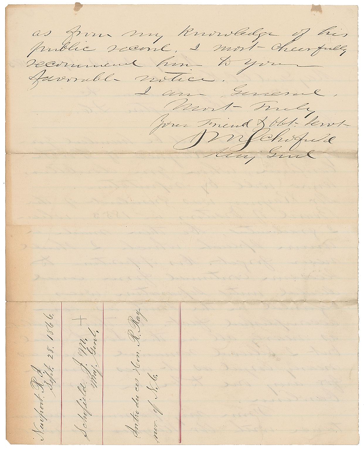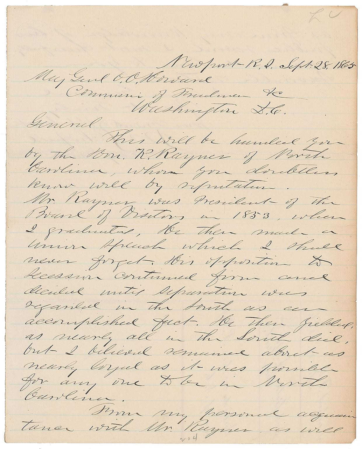 ALS signed “J. M. Schofield, Maj. Gen'l,” one page both sides, 8 x 10, September 28, 1866. Letter to Union General Oliver Otis Howard, in full: "This will be handed you by the Hon. R. Rayner of North Carolina, whom you doubtless know well by reputation. Mr. Rayner was president of the Board of Visitors in 1853, when I graduated. He then made a Union speech which I shall never forget. His opposition to secession continued firm and decided until separation was regarded in the South as an accomplished fact. He then yielded as nearly all in the South did, but I believed remained about as nearly loyal as it was possible for any one to be in North Carolina. From my personal acquaintance with Mr. Rayner as well as from my knowledge of his public record, I most cheerfully recommend him to your favorable notice." In fine condition. Kenneth Rayner (1808–1884), a planter, lawyer, and Whig politician from North Carolina, opposed both slavery and secession. He served in the U.S. House of Representatives between 1839 and 1845, and his passionate speeches alienated fellow Southerners.