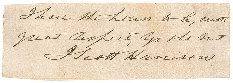 Member of the United States House of Representatives from Ohio (1804-1878) and the only man to be both the son and the father of U. S. Presidents. Ink signature, “I have the honor to be, with great respect, yr. obt. svt., J. Scott Harrison,” on an off-white 4 x 1.25 lightly-lined slip clipped from the closing of a letter. In fine condition, with some scattered light toning and soiling. RRAuction COA.