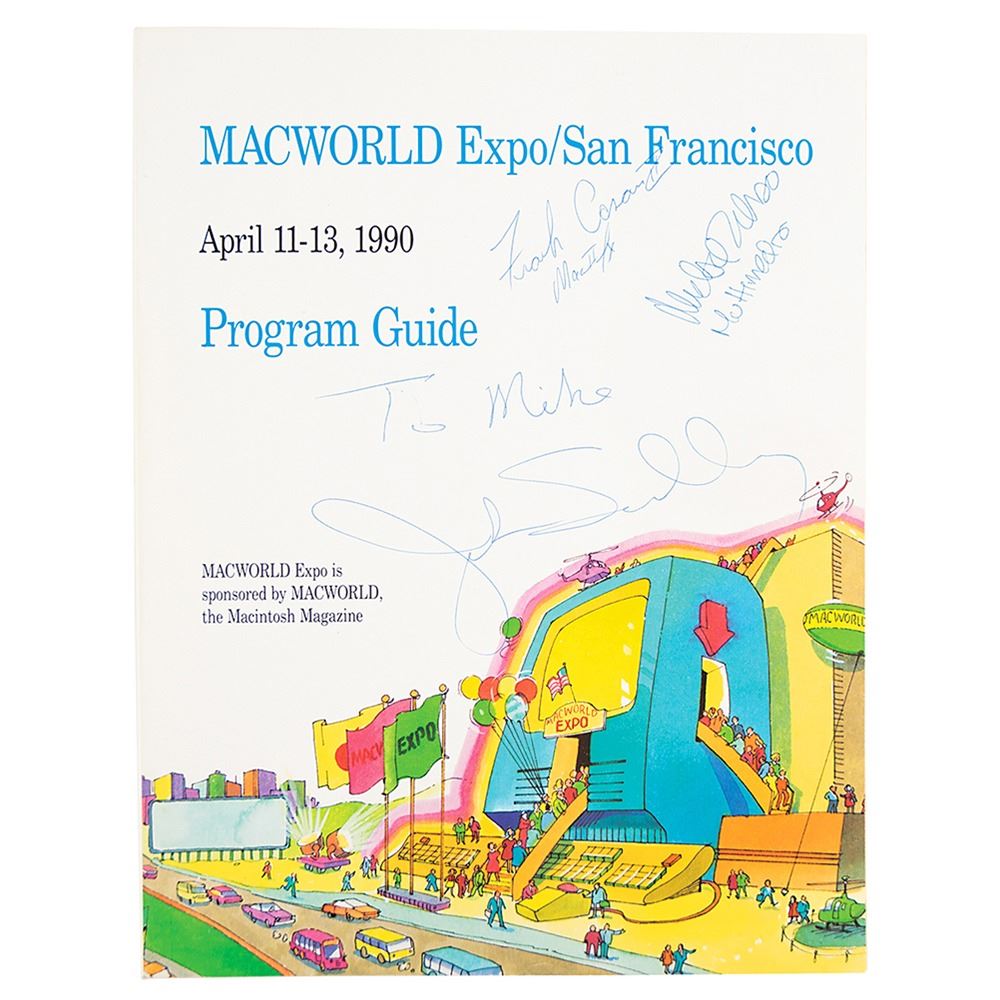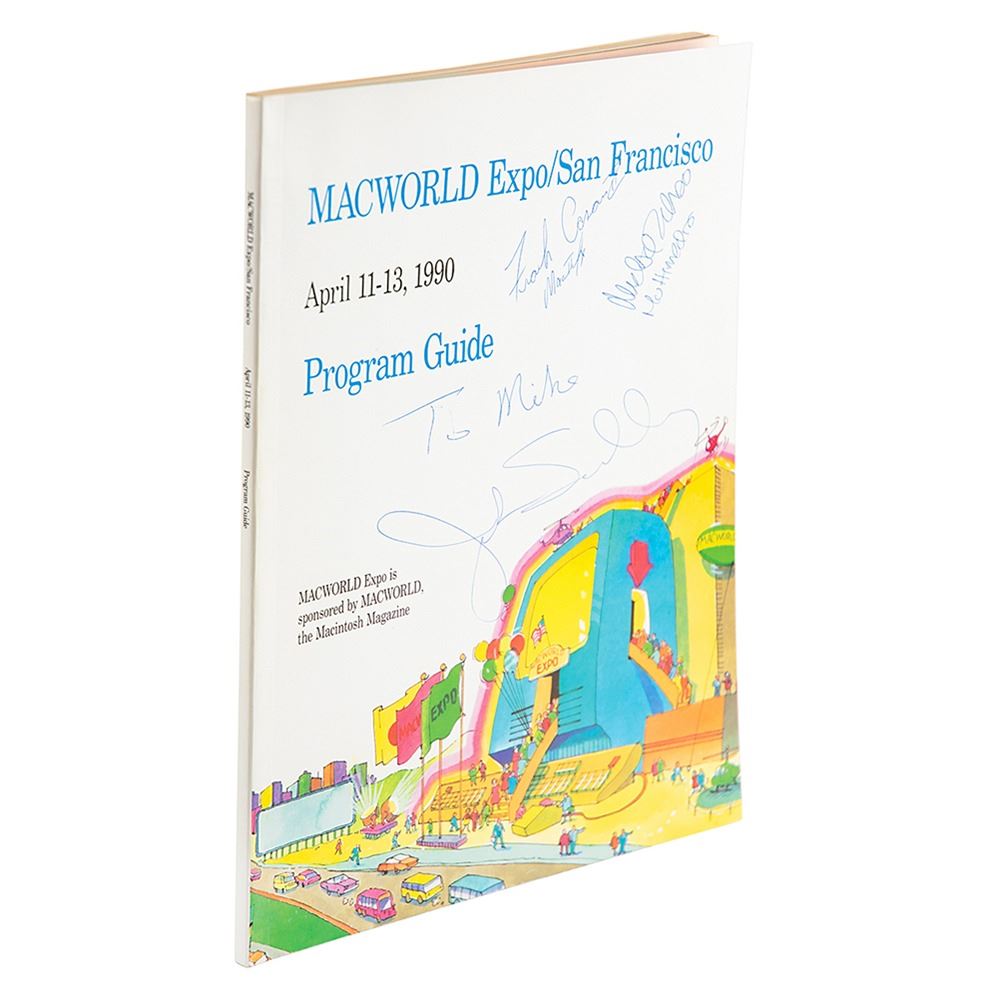 Program guide from the Macworld Expo in San Francisco, April 11-13, 1990, 160 pages, 8.5 x 11, signed and inscribed on the front cover in blue ballpoint, "To Mike, John Sculley." Also signed by two engineers who worked on the Macintosh IIfx and Multimedia products. Sculley joined Apple Computer as CEO in 1983, a position he held for a decade. During that period, he was instrumental in developing the market for the Macintosh computer and ushered in the 'first golden age' of the Mac. In spite of his successful leadership on the business side, Sculley may be best remembered for clashing with Steve Jobs on management style and corporate prioritieswhich ultimately led to Jobs' ouster from Apple. In fine condition.