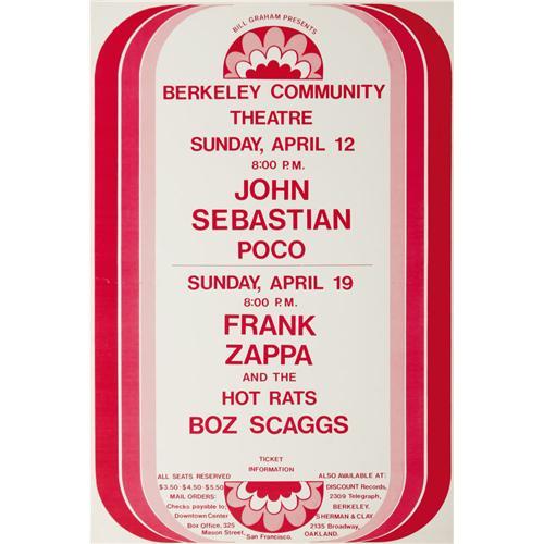 <B>John Sebastian/Poco/Frank Zappa Berkeley Community Theatre Concert Poster (Bill Graham, 1970).</B></I> A rather generic-looking poster for two diverse shows in Berkeley. First up, former Lovin' Spoonful frontman John Sebastian and Poco pair up for a cozy, Country/Folk style concert on Sunday, April 12, 1970. The following week, a more eclectic show featuring Frank Zappa, New York City streetpunk band Hot Rats, and rock/blues crooner Boz Scaggs (fresh from his stint as lead guitarist for the Steve Miller Band). A little something for everyone! The poster measures approximately 13.5" x 20.25", and is in NM- condition.<BR><BR><b>Shipping:</b> Flat Material, Large (<a target="_blank" href="http://www.heritageauctions.com/common/shipping.php">view shipping information</a>)