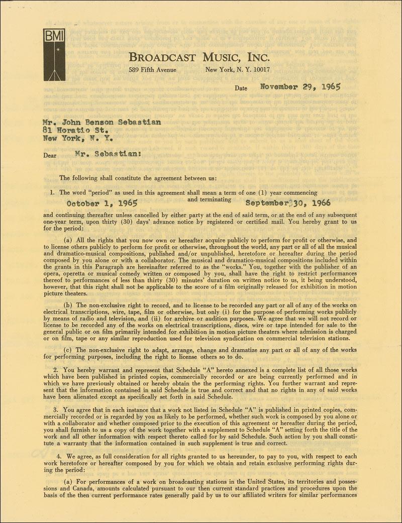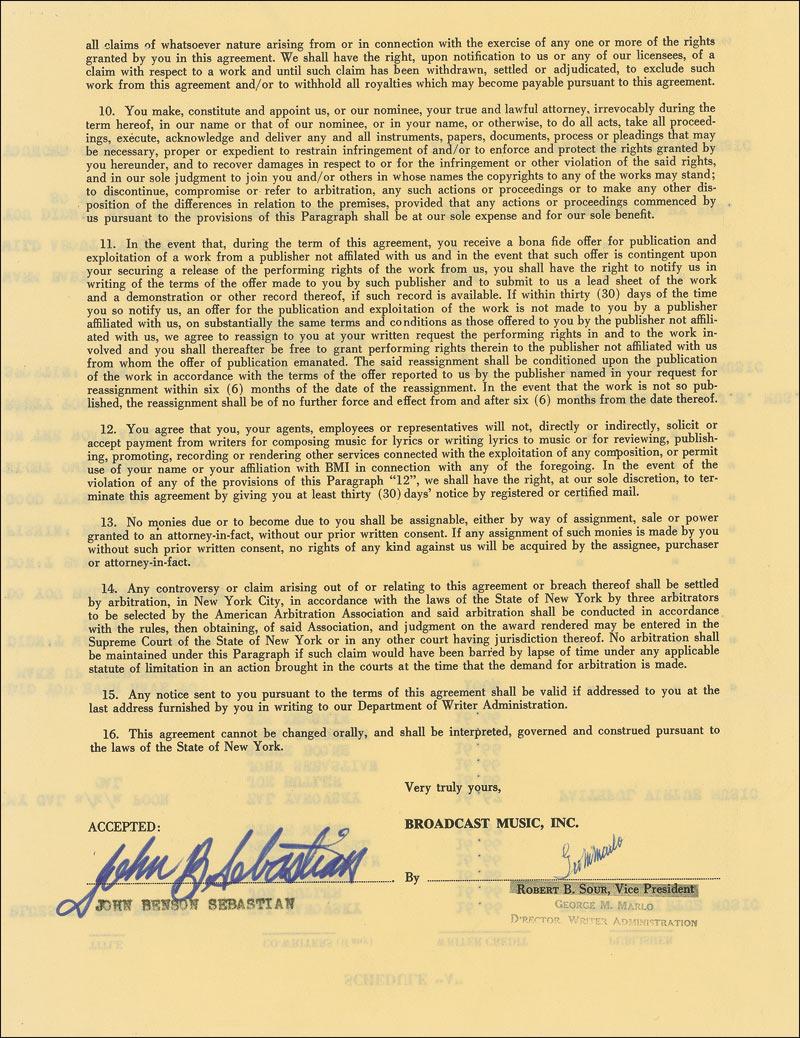 DS, signed “John B. Sebastian,” two pages both sides, 8.5 x 11, November 29, 1965. One-year agreement between Sebastian and Broadcast Music, Inc. regarding 16 songs (many Lovin’ Spoonful songs) including ‘Did You Ever Have to Make Up Your Mind’ and ‘Do You Believe in Magic.’ In part: “You hereby grant to us for the period…All the rights that you now own or hereafter acquire publicly to perform for profit or otherwise…the non-exclusive right to adapt, arrange, change and dramatize any part or all of any of the works for performing purposes, including the right to license others so to do.” In fine condition, with light wrinkling, handling wear, and staple holes at the top left edge.
