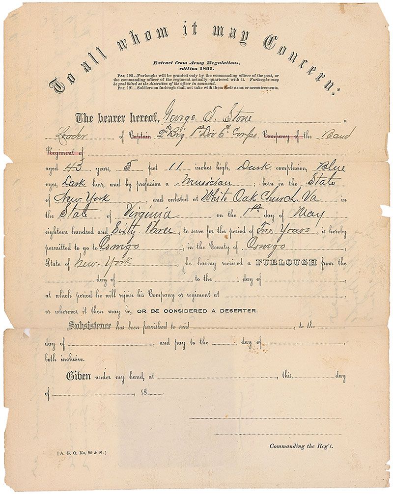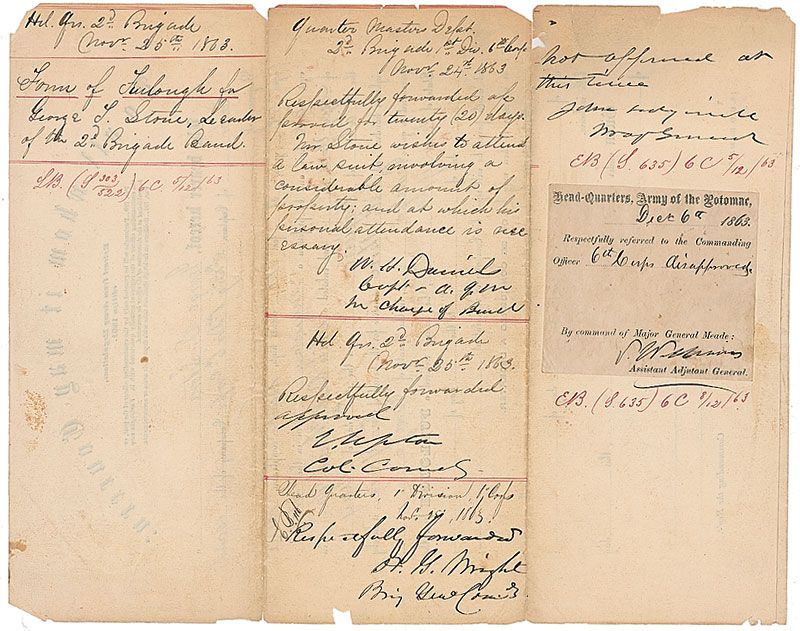 Union general (1813–1864) who was killed by Confederate sharpshooters at the Battle of Spotsylvania Court House, ironically while berating his men for hiding from enemy fire. War-dated handwritten endorsement on the reverse of a document, one page, 8 x 10, dated late 1863. Document is a request for a furlough to George Stone, a “loader of 2nd Brig Dic 6th Corps of the Band.” Endorsed on the reverse, “Not approved at this time. John Sedgwick, Maj. General.” Reverse also bears five other endorsements. Several clean separations along fragile horizontal folds, none affecting Sedgwick’s endorsement, a few chips to edges, and some light rippling, otherwise very good condition.