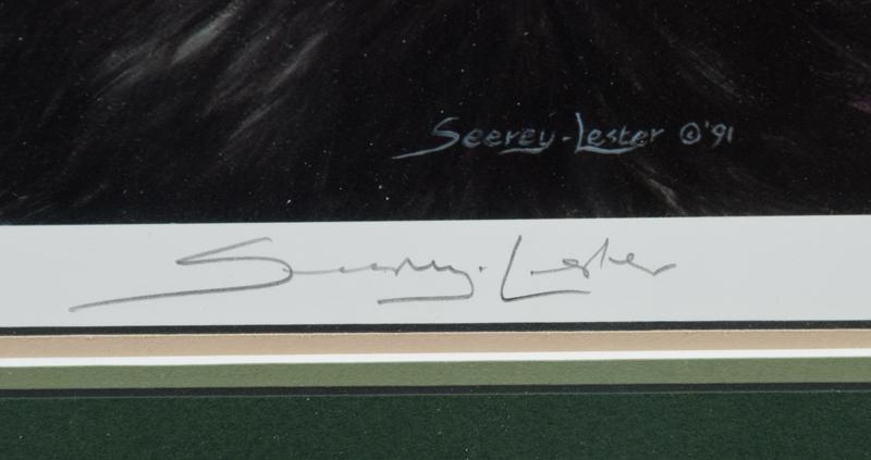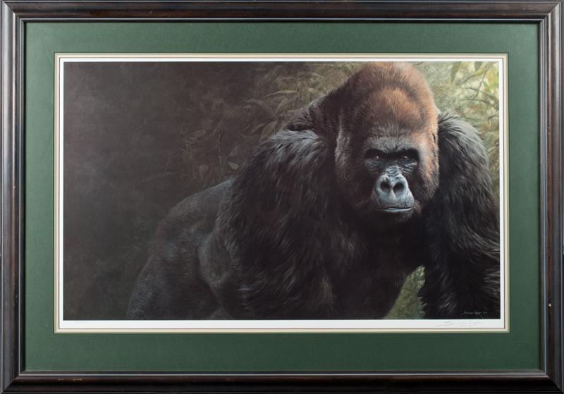 Depicting a Mountain Male Gorilla amongst foliage, pencil signed LR, #141/1250, nicely framed and matted. 30" H x 42.5" W (including frame).