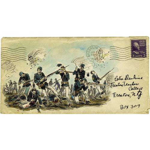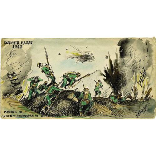 <B>John Severin - Illustrated Letter and Envelope Original Art, Group of 2 (1941-42). </B></I> John Severin was a fan of Western artist Charlie Russell's illustrated letters and these two illustrated missives, sent to Severin's pal, Collin Dawkins, show a distinct Russell influence. In fact, Severin mentions both Frederic Remington and Charles Russell in his July 6, 1942 letter. The envelope of one of these letters is illustrated with a Marine battle scene, while the other features a scene of the frontline of the Union Army. The envelopes measure an overall 7.5" x 4", while the tri-folded letters measure 7.5" x 10.5". These pieces average Very Good condition.<BR><BR><b>Shipping:</b> Flat Material, Small (<a target="_blank" href="http://www.heritageauctions.com/common/shipping.php">view shipping information</a>)