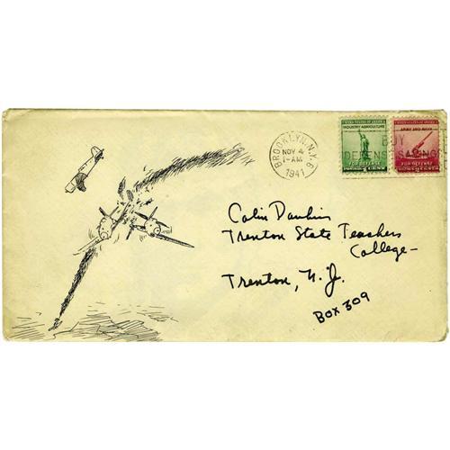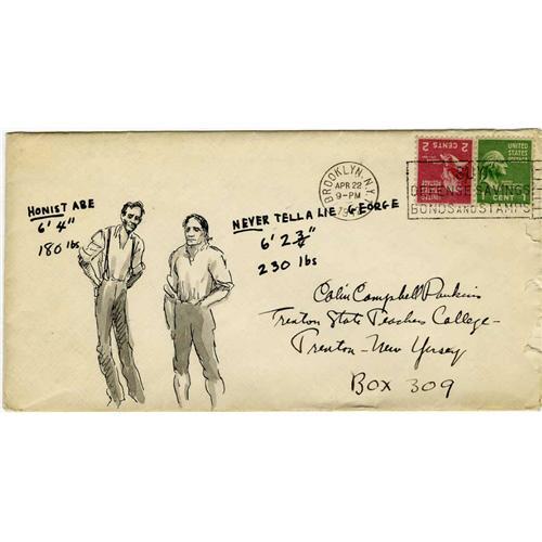 <B>John Severin - Illustrated Letter and Envelope Original Art, Group of 2 (1941-42). </B></I> These letters feature a treasure-trove of early John Severin drawings. The November 4, 1941 letter has an aviation theme, while the envelope for the April 22, 1942 letter features a height and weight comparison of "Honest" Abraham Lincoln and "Never tell a lie" George Washington. The envelopes measure an overall 7.5" x 4", while the tri-folded letters measure 7.5" x 10.5". These pieces average Very Good condition.<BR><BR><b>Shipping:</b> Flat Material, Small (<a target="_blank" href="http://www.heritageauctions.com/common/shipping.php">view shipping information</a>)