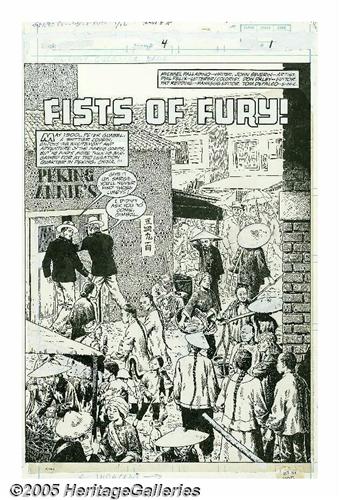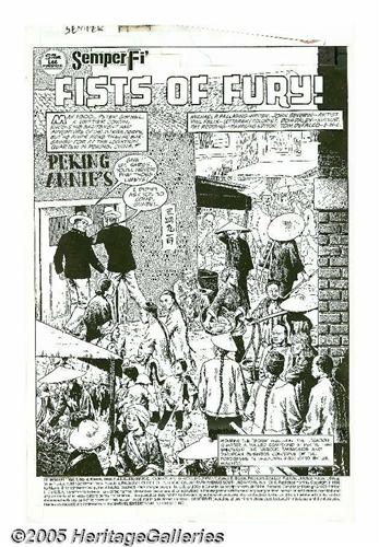 <B>John Severin - Semper Fi #4, Splash Page 1 Original Art (Marvel, 1989).</B></I> Peking, China, circa 1900, serves as the backdrop for the United States Marine yarn, "Fists of Fury." <B>Semper Fi</B></I> told about thrilling Marine missions throughout history and around the world. John Severin drew this detailed panoramic scene on cream colored vellum which was then affixed to a larger support board. The image area of the page is 10" x 15". The word balloons and caption boxes on the splash are pasted-on elements, and there are touches of white-out, used to crisp up the artwork; otherwise the art is in Very Good condition. Also included in the lot is a full-sized photostat of the page with rearranged and additional captions.
