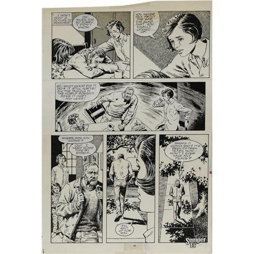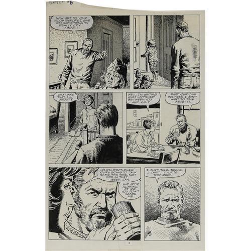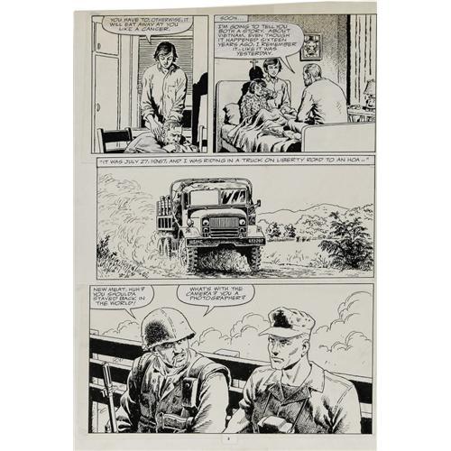 <B>John Severin - Semper Fi #6 Page Original Art, Group of 3 (Marvel, 1989).</B></I> A Vietnam war vet recounts a painful war story to his family in these hard-hitting pages from <B>Semper Fi</B></I> #6. Fifteen years later, he is still haunted by his war memories. This lot includes pages 3, 4, and 20 of the story. The art was drawn on cream colored vellum which was then affixed to larger support pages. The image area of each page is 10" x 15". The word balloons and caption boxes are pasted-on elements, and there are touches of white-out, used to crisp up the artwork; otherwise the art is in Very Good condition.