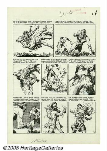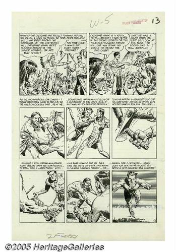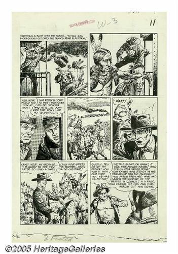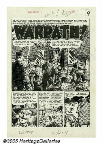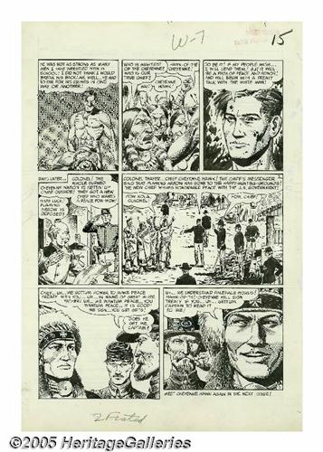 <B>John Severin - Two-Fisted Tales #38, Complete 7-page Story, "Warpath" Original Art (EC, 1954).</B></I> When Harvey Kurtzman changed his EC workload to accommodate the new monthly schedule for <B>Mad</B></I>, the editorship of <B>Two-Fisted Tales</B></I> was delegated to John Severin. Severin recalled, "I decided, what the heck, maybe I could have some fun with it, because I like all kinds of adventure stories. It's a variety book; I wouldn't have to keep it a war thing. I didn't want to keep doing the same Korean war thing over and over." John Severin's uncanny talent for drawing was showcased in each of the title's many period pieces. Regarding "Warpath," Severin has recalled, "Cheyenne Hawk was our attempt to bring American Eagle back from <B>Prize Comics Western</B></I> over to <B>Two-Fisted Tales</B></I>, because we really enjoyed American Eagle and his sidekick, Laughing Dog." The art for "Warpath" was drawn on a small scale, with each page's image area measuring approximately 9" x 12". Severin still manages to pack the thriller with incredible detail and rich visual textures. Except for a small stain in panel two of page one, the art is in Excellent condition.