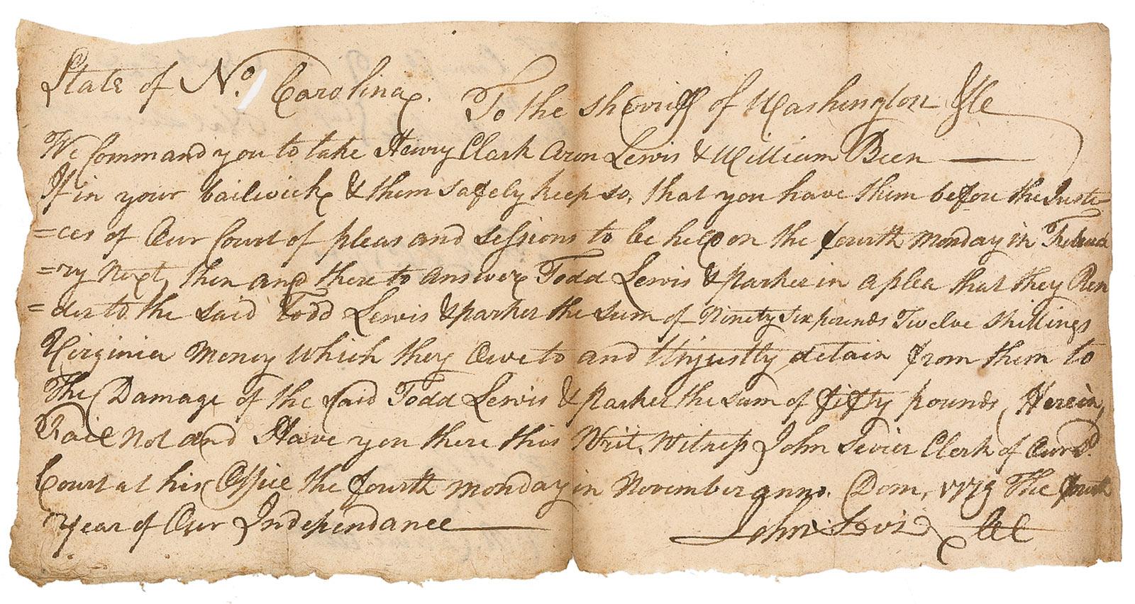 Served four years as the only governor of the State of Franklin and twelve years as Governor of Tennessee. Rare ADS, one page, 8.25 x 4.25, November 22, 1779. Order to the Sheriff of Washington County, North Carolina commanding him to take Henry Clark, Aron Lewis, and William Been into custody to answer to Todd Lewis over a financial matter of 96 pounds owed to Lewis. Signed at the conclusion by Sevier. In very good condition, with several vertical creases, rough edges, somewhat irregular top left edge, and scattered toning (heaviest along central fold).