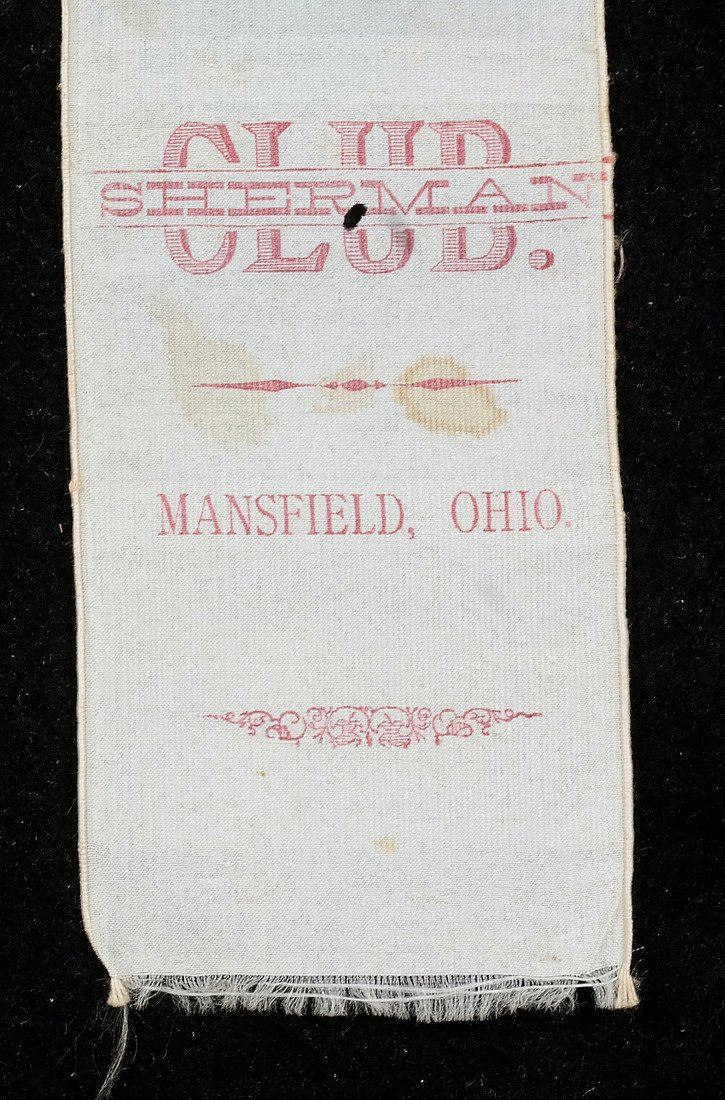 Comprises: 1.) Off-white satin ribbon boldly imprinted in black ink "Sherman" diagonally and in red ink "Sherman Club / Mansfield, Ohio." 2.) Red satin ribbon imprinted in black ink "For / President / John /Sherman."